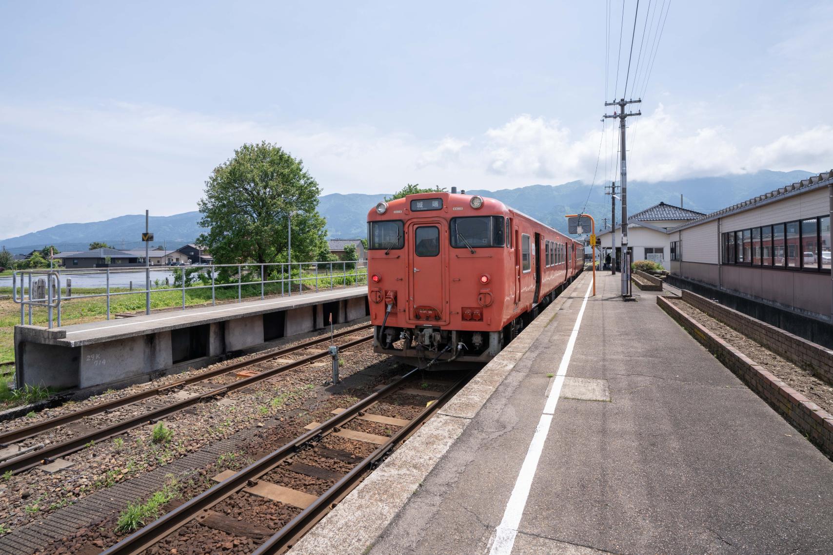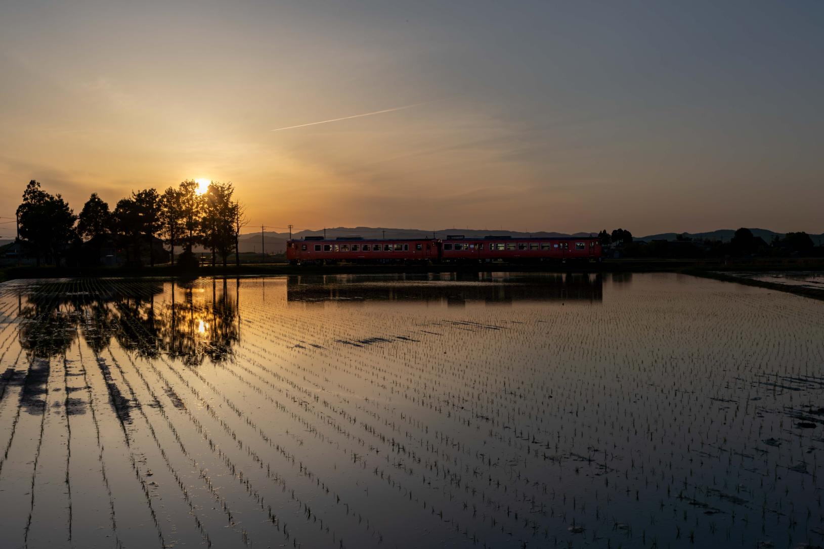 水が張られた田んぼに映る列車や、周辺の山々とのコラボレーションは絶景です。