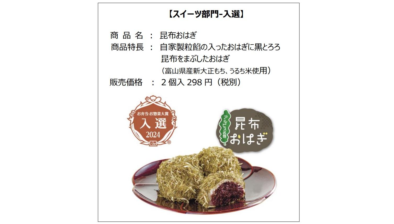 県内各所にあるスーパーマーケットアルビスは、自社で製造している「おはぎ」が名物でお惣菜コーナーにたくさん並んでいます。「おはぎ」の新メニューとして開発した「昆布おはぎⓇ」は一般社団法人全国スーパーマーケット協会主催「お弁当・惣菜大賞2024」のスイーツ部門において「入選」を獲得されたそうです。