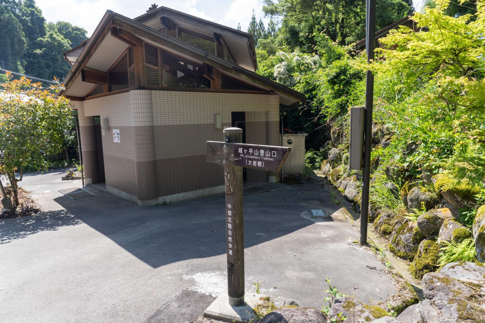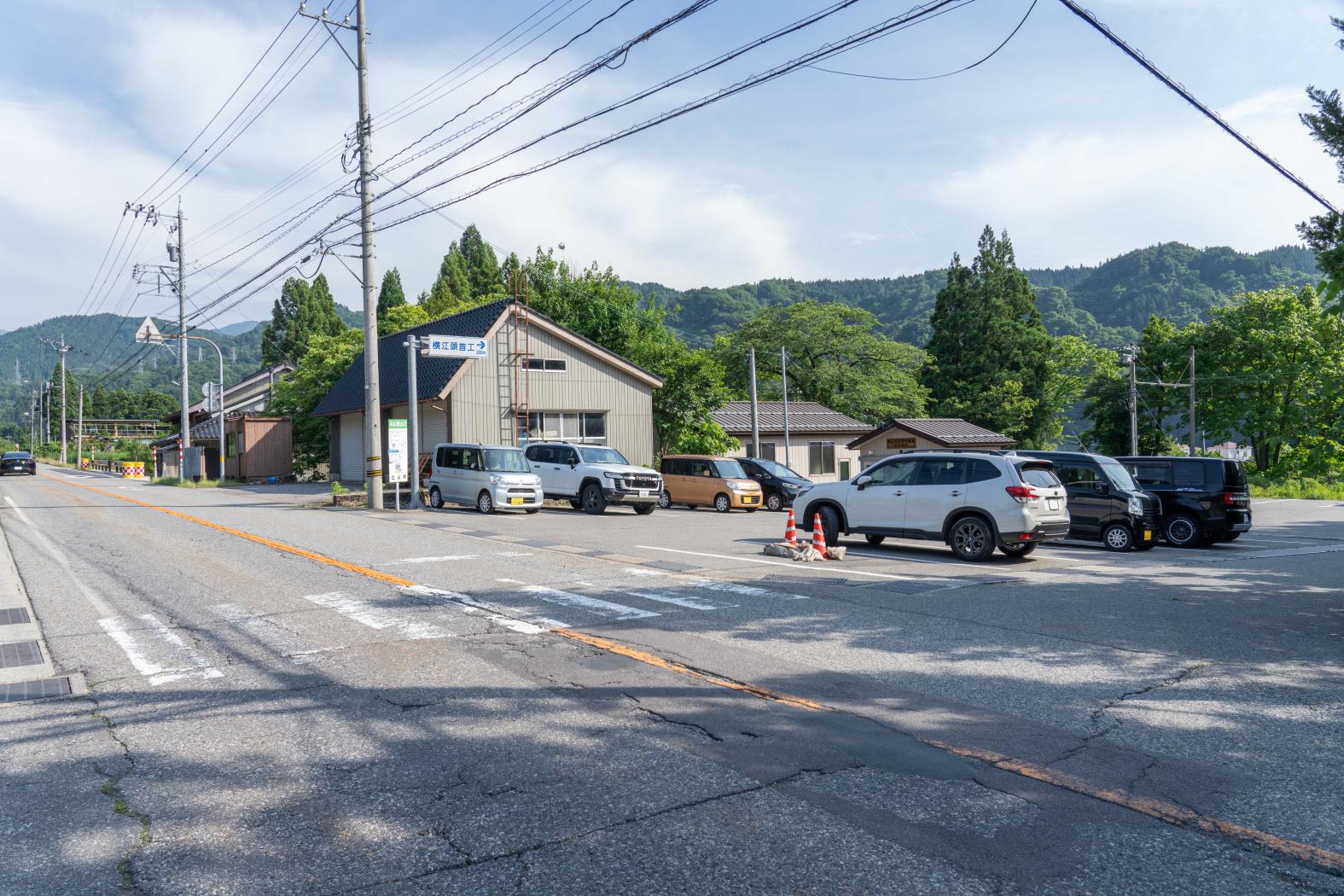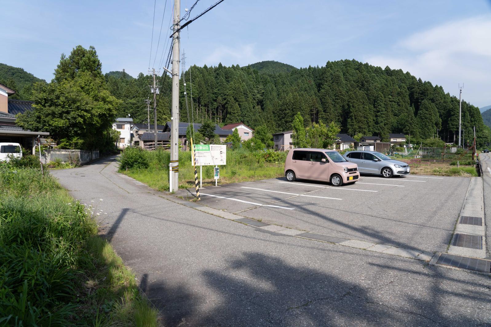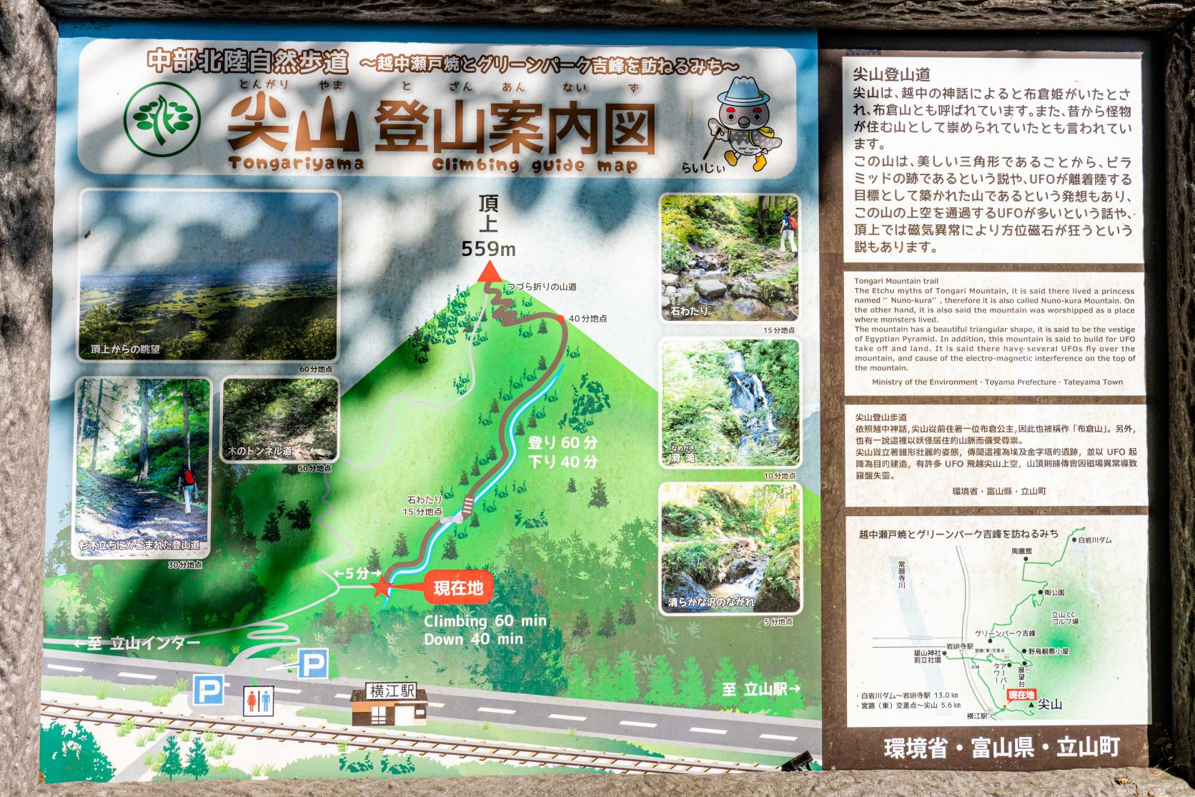 案内図の「現在地」まで車で入れますが、少し細い山道を通るので、富山地方鉄道「横江駅」前の登山駐車場を利用すると安心です。