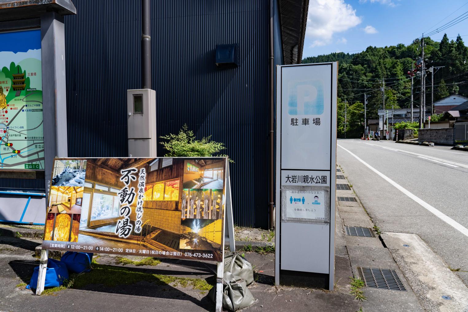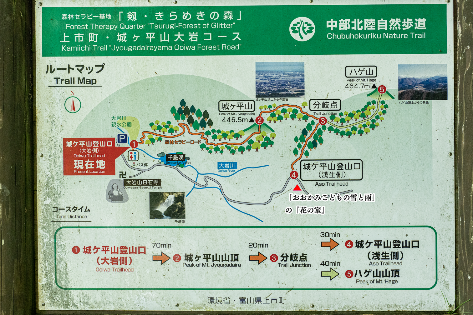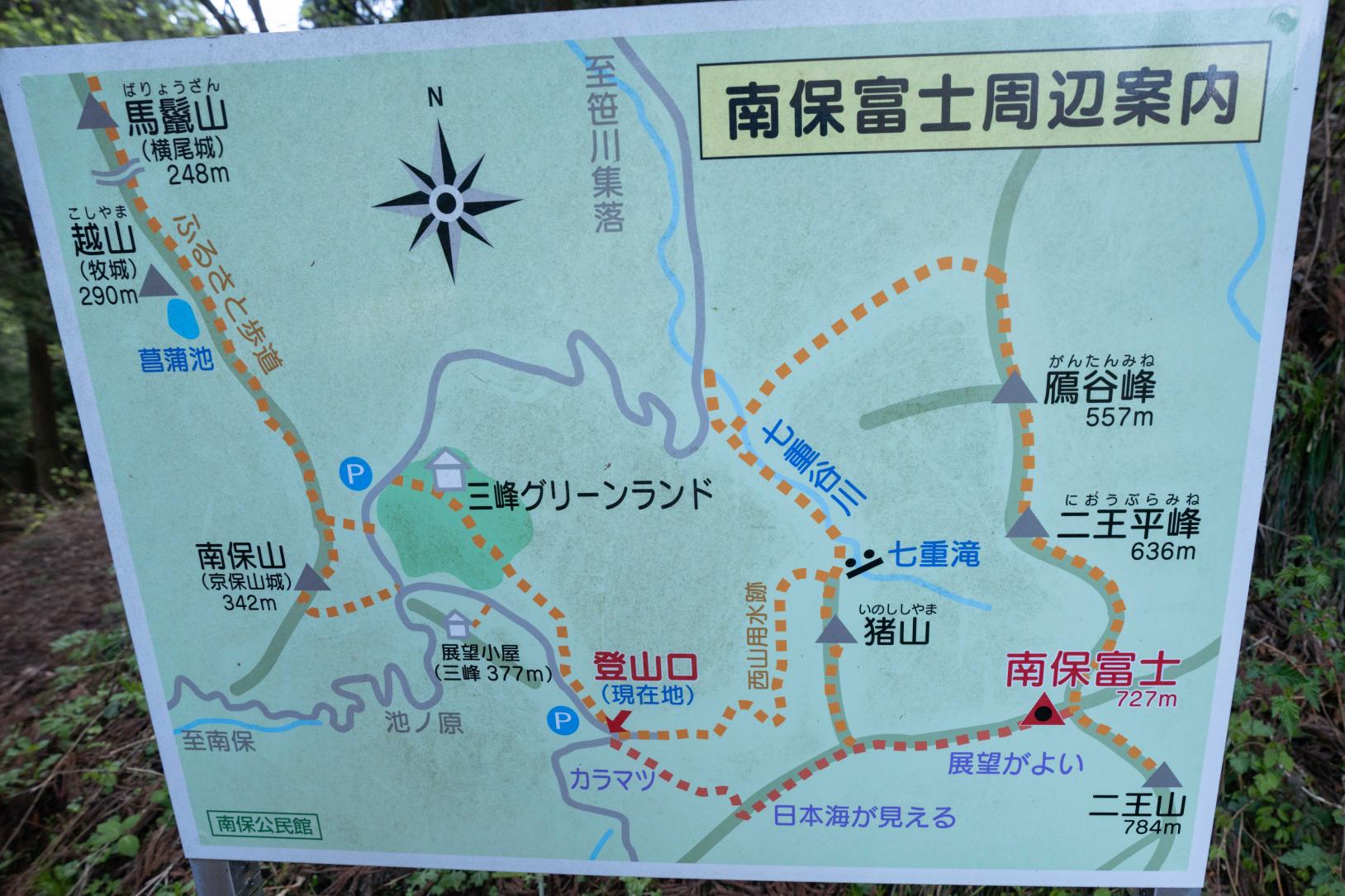 案内図の「現在地」まで車で入れますが、少し細い山道を通るので、富山地方鉄道「横江駅」前の登山駐車場を利用すると安心です。