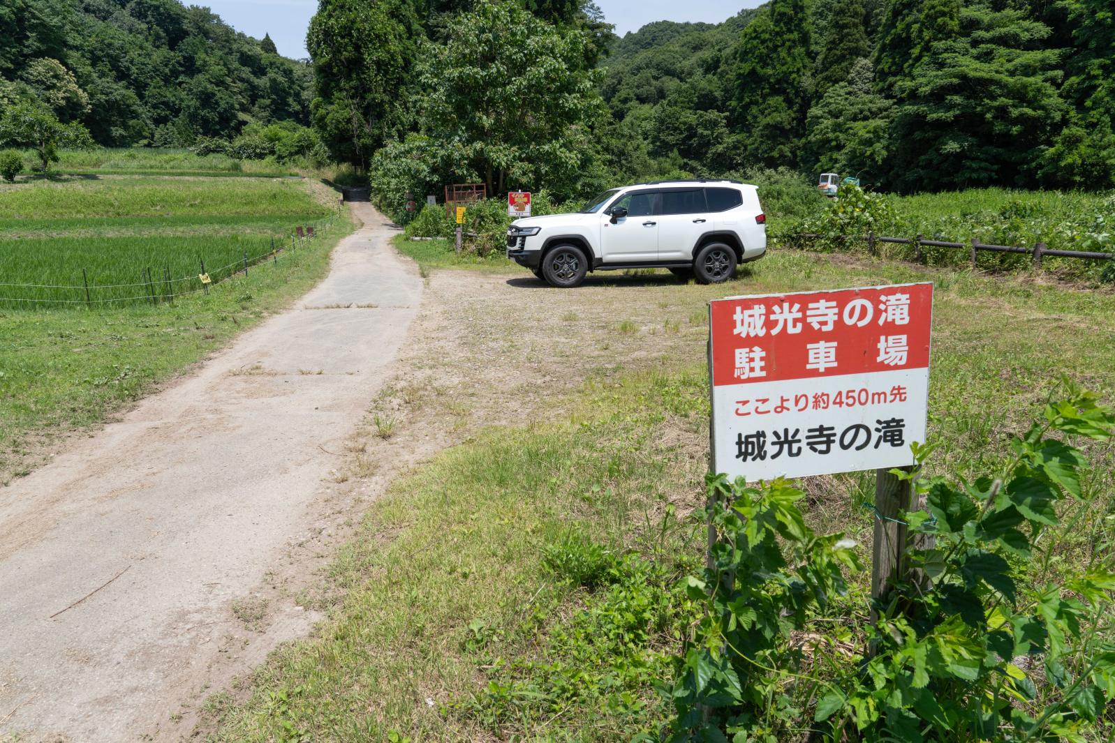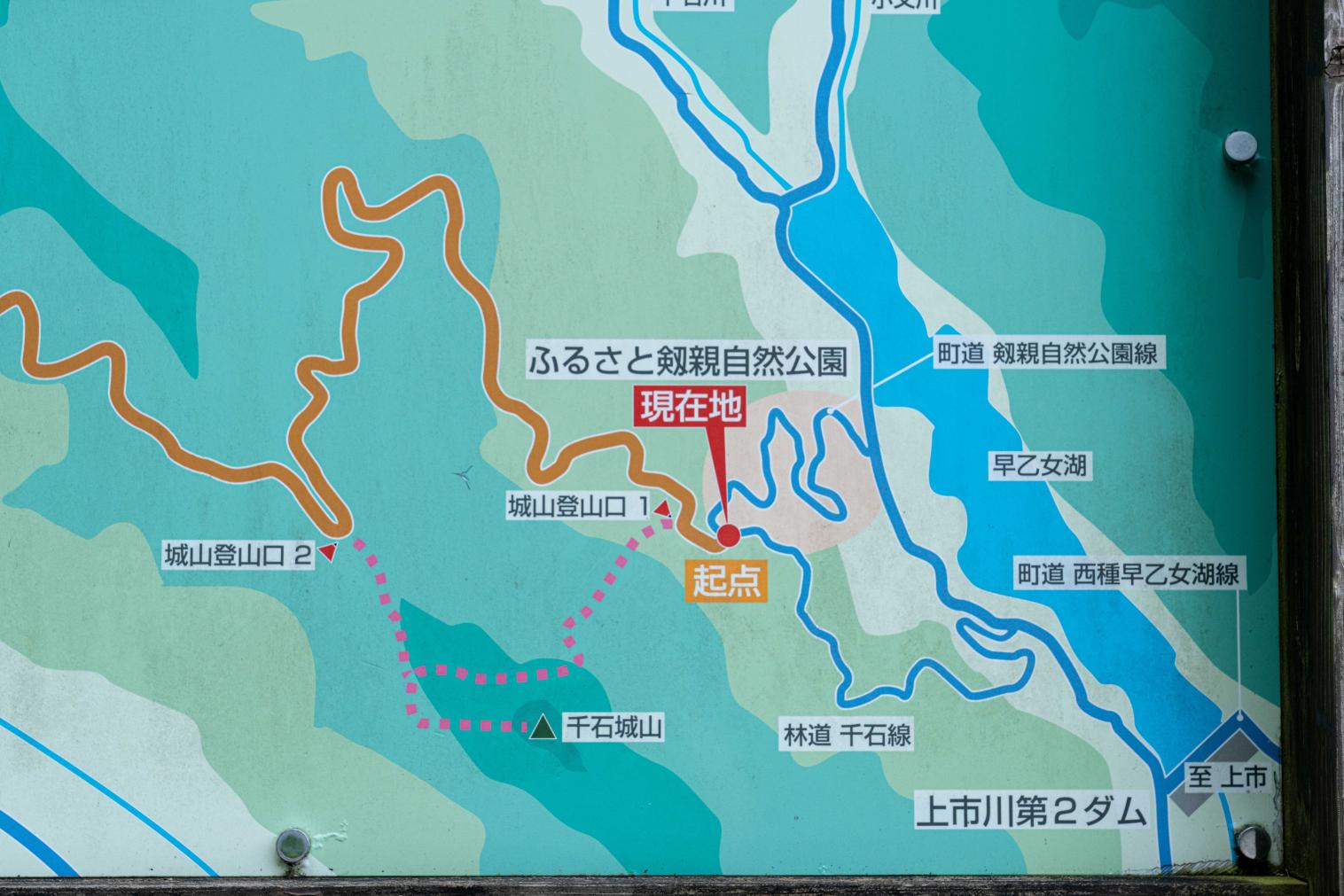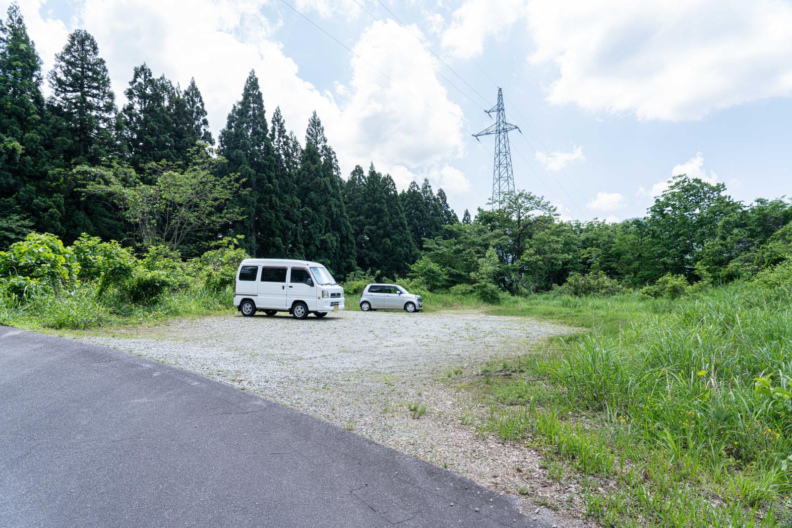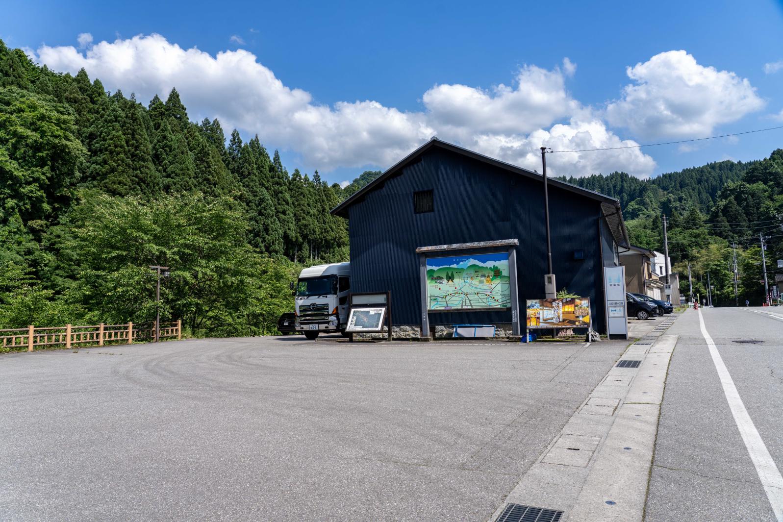 案内図の「現在地」まで車で入れますが、少し細い山道を通るので、富山地方鉄道「横江駅」前の登山駐車場を利用すると安心です。