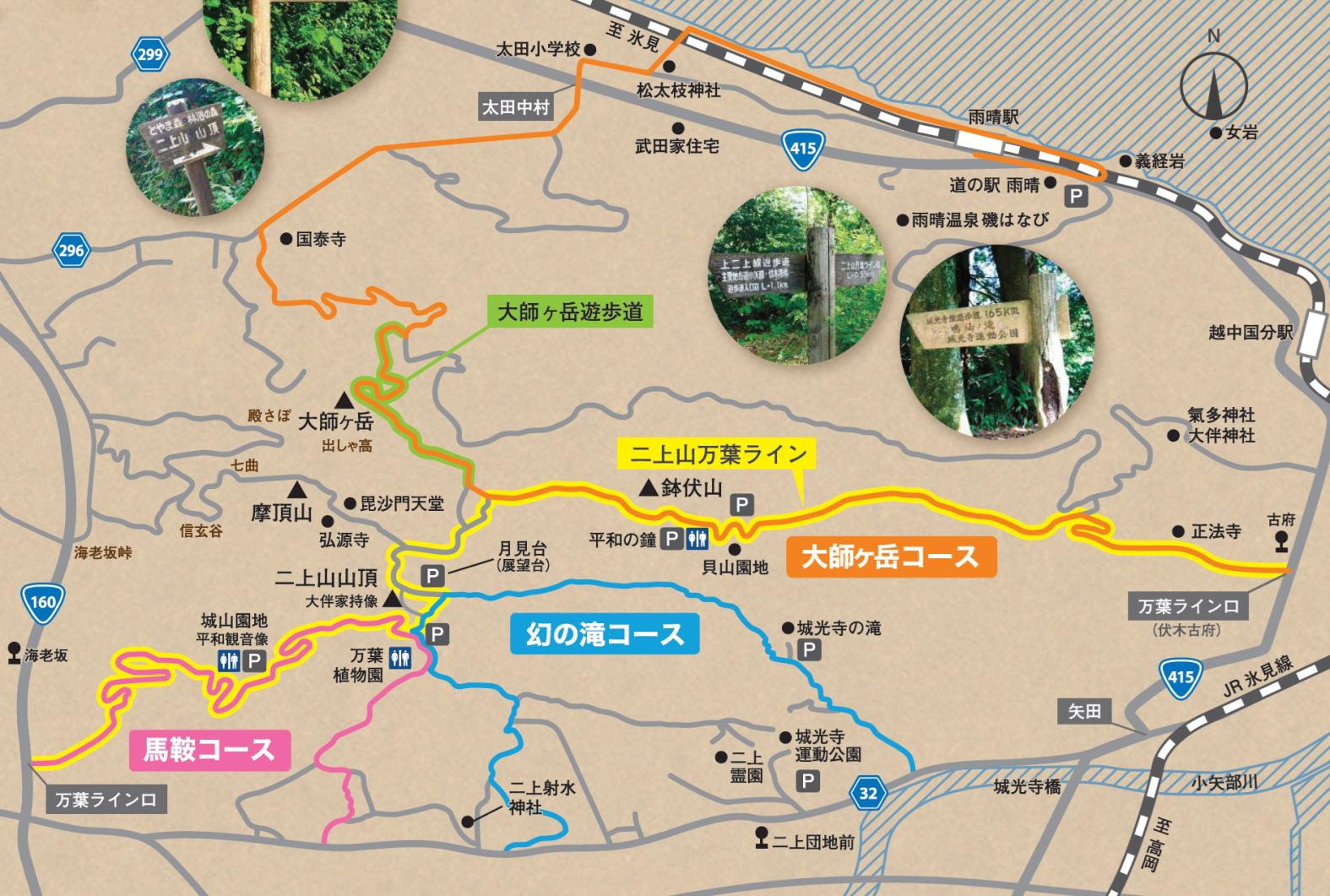 「二上射水神社」駐車場や「二上まなび交流館」の駐車場が利用できる、地元でも定番の登山道です。