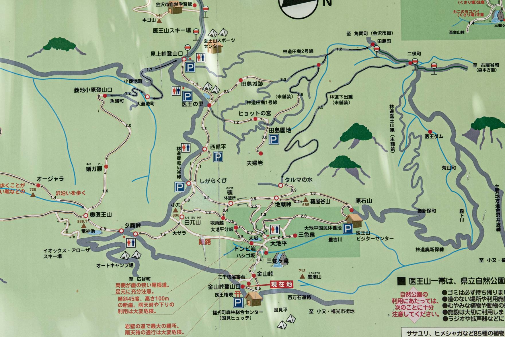 南砺市と石川県にまたがる山で、石川県側から緩やかな登山道が多くあります。富山県側からは「夕霧峠」まで車で行って、『奥医王山(おくいおうぜん)』や『白兀山(しらはげやま)』まで登るルートがおススメです。上写真の現在値「金山峠登山口」から大正池へ向かうルートは危険なのでおススメできません。