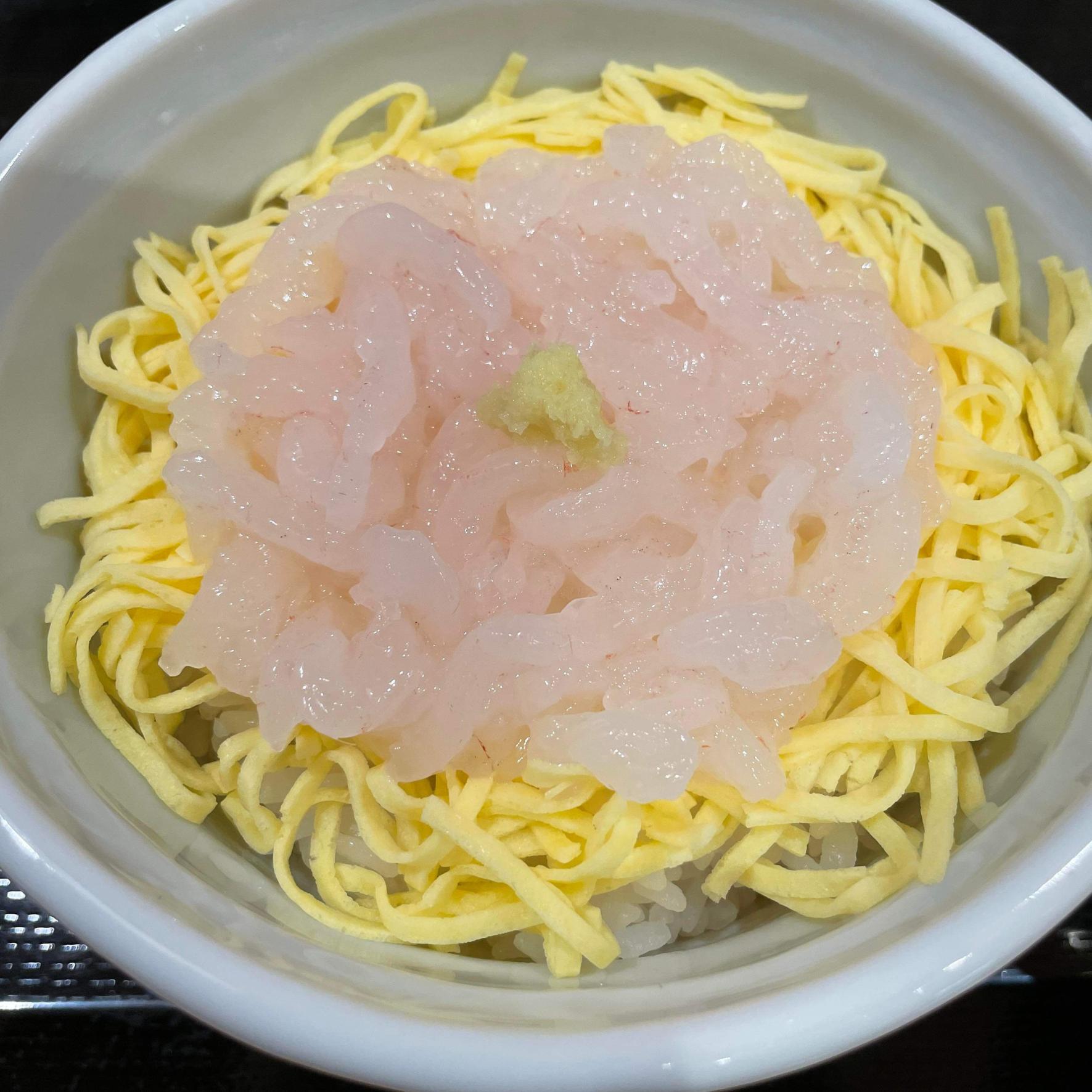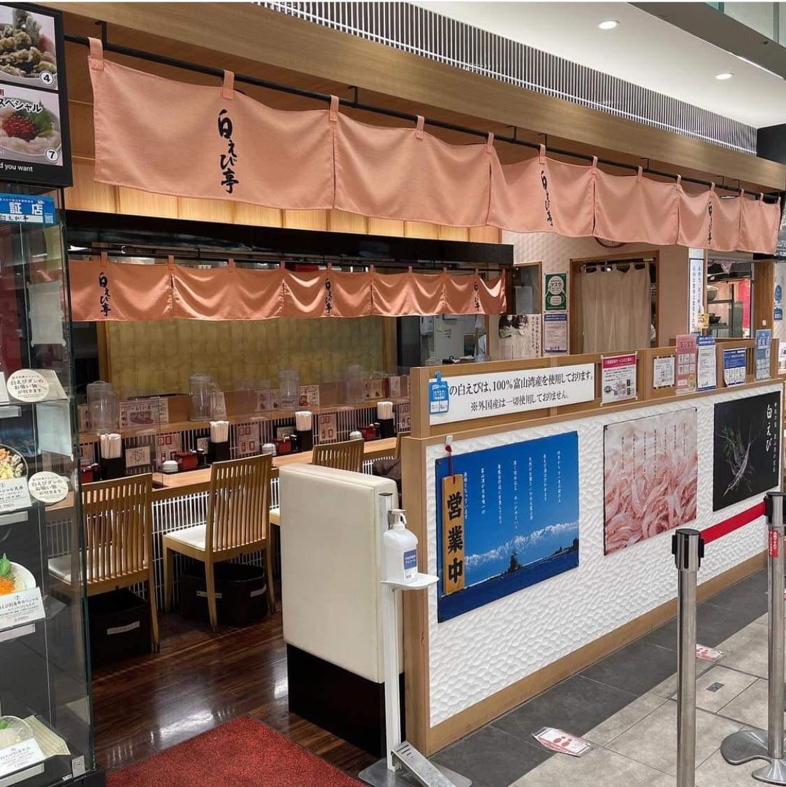 毎朝新湊漁港から直送される、手むき白えび刺身90匹を使った「白えび刺身丼」が食べられるのはこちらの白えび亭さん。同じフロアで「白えびせんべい」をはじめ、「白えびのお刺身」「白えびの素干し」などを販売している「白えび屋」が運営する飲食店。富山ではとやマルシェだけですが、東京駅地下1階「東京駅一番街」にも進出している大人気店です。