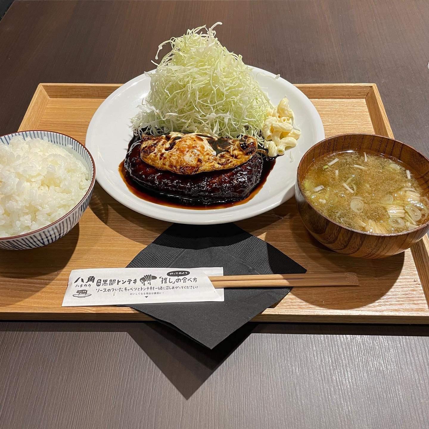 黒部の人気店「黒部トンテキ八角」さんのマリエ富山店限定の「月見トンバーグ 」。二人で行って名物「黒部トンテキ」とハーフアンドハーフにして食するのもお薦めです。黒部が本店というだけあってとろろ昆布がたっぷり入ったお味噌汁がまた旨い。