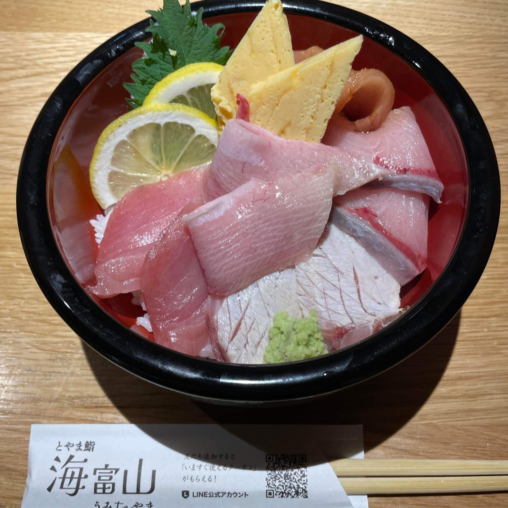 「とやま鮨 海富山」さんの季節限定「氷見鰤丼」です。炙りや漬けも入って、いろいろな鰤の味わいを楽しめます。富山湾鮨も提供されており、職人の技が光る自慢の料理を地酒とともに堪能できます。