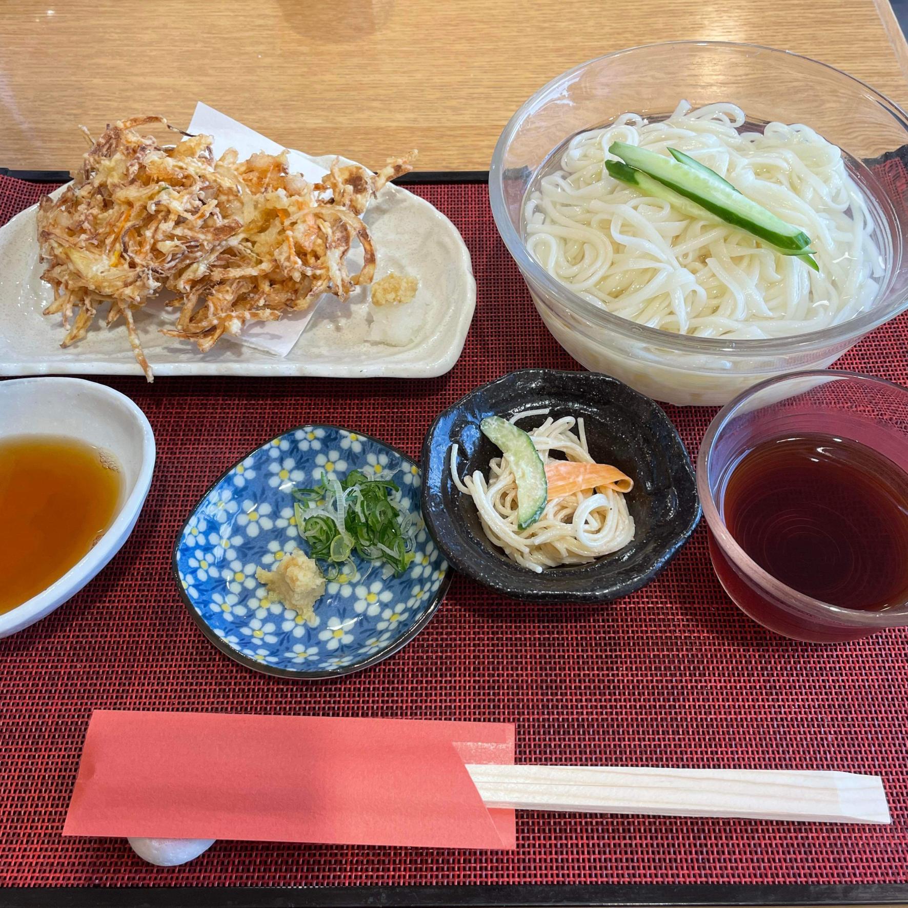 南部鉄釜でお米から炊きあげる釜めしで有名な「岡万」さん。写真は期間限定ランチメニュー「白海老かき揚げと氷見うどん」です。夜は、40年変わらず駅前で営業されている老舗居酒屋の旬の魚や野菜に食欲をそそられます。