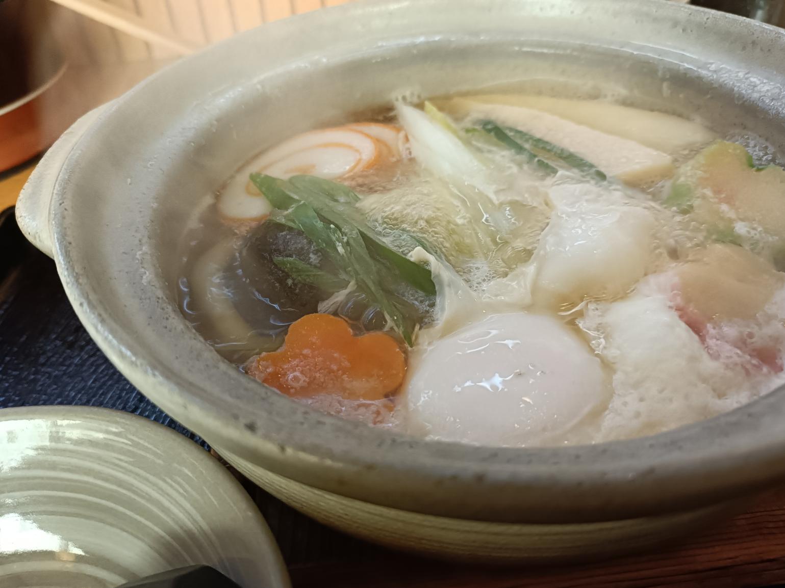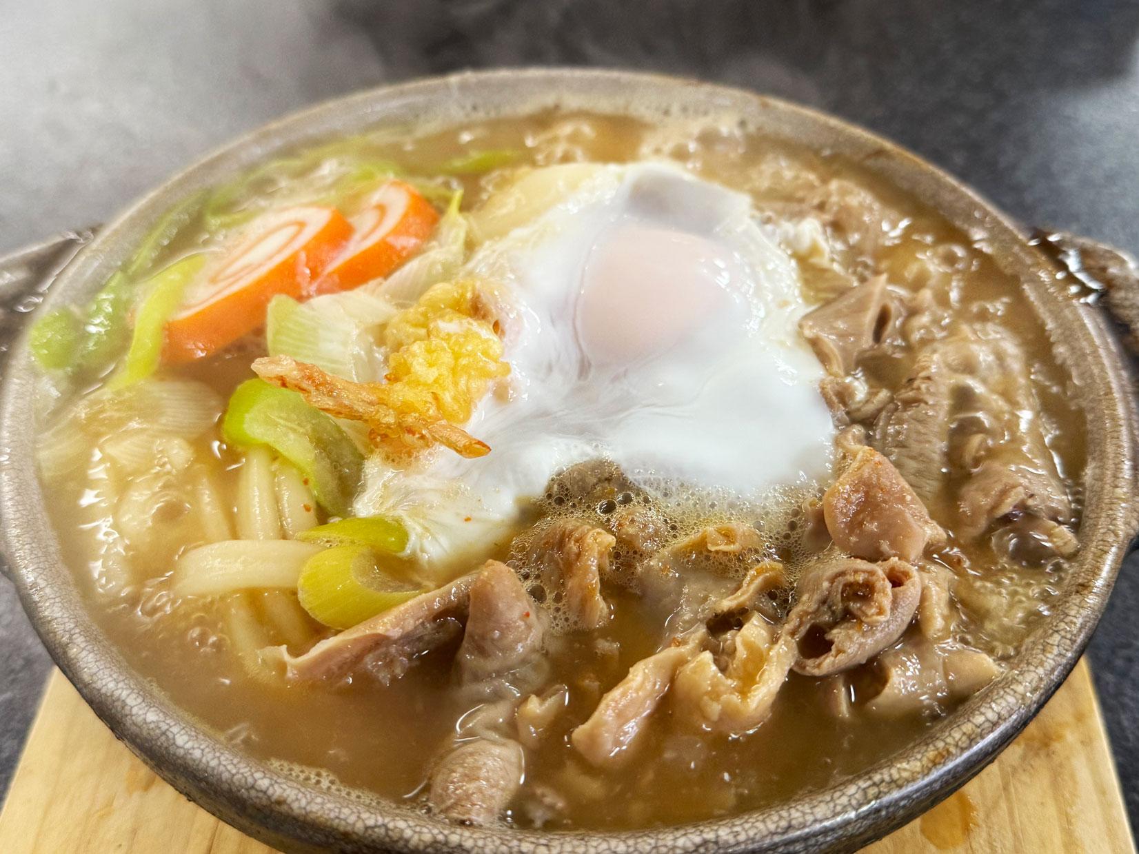 もう一つのおすすめメニューは、冬季限定の「鍋焼きうどん」です。ビビンバ用の器を使用しており、食べ終わるまでぐつぐつとした状態で楽しむことができます。