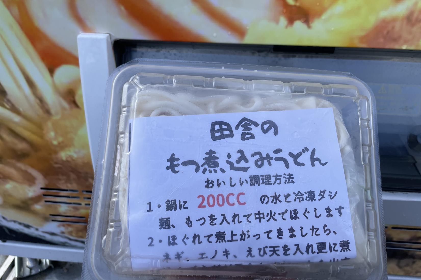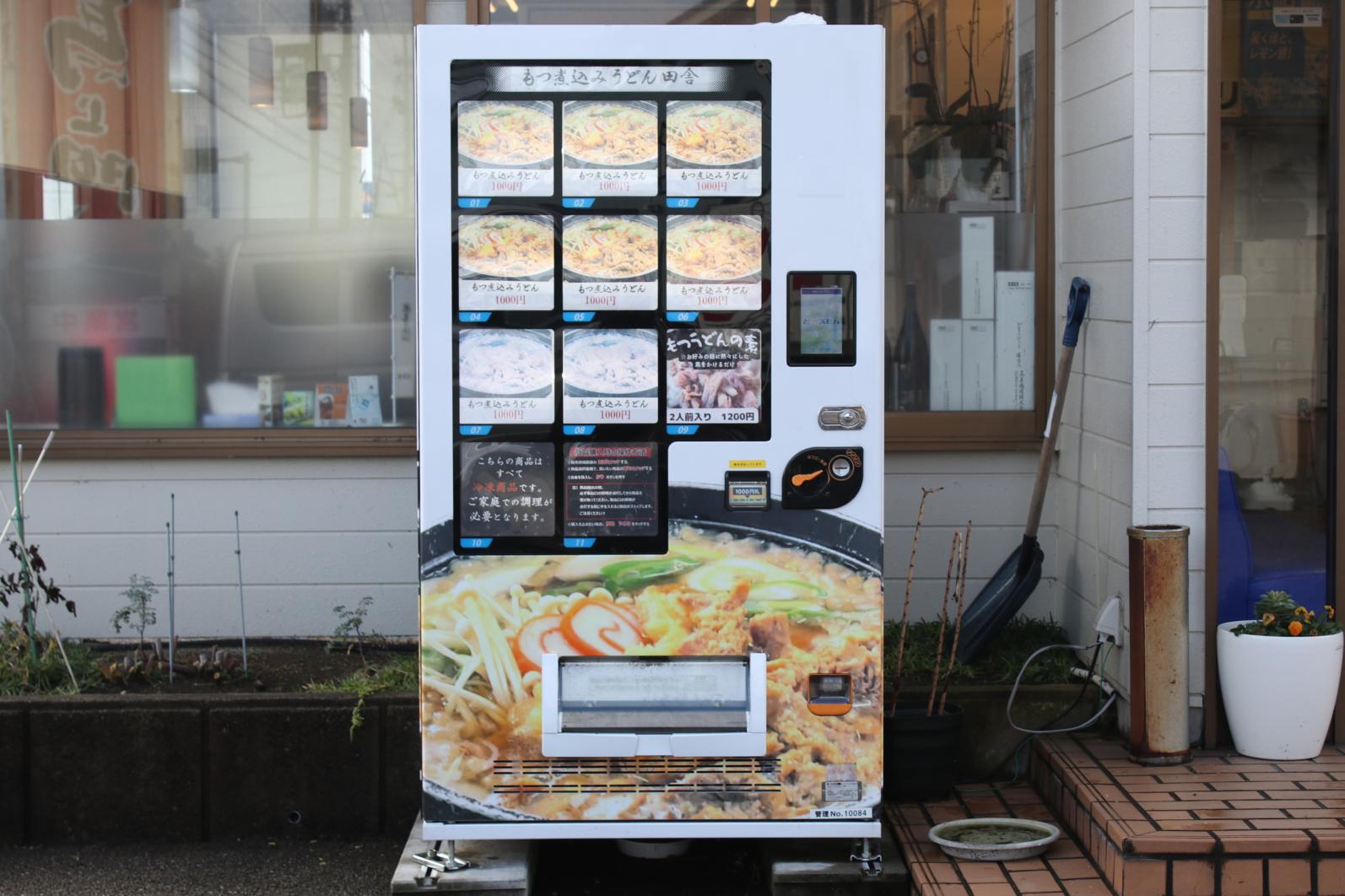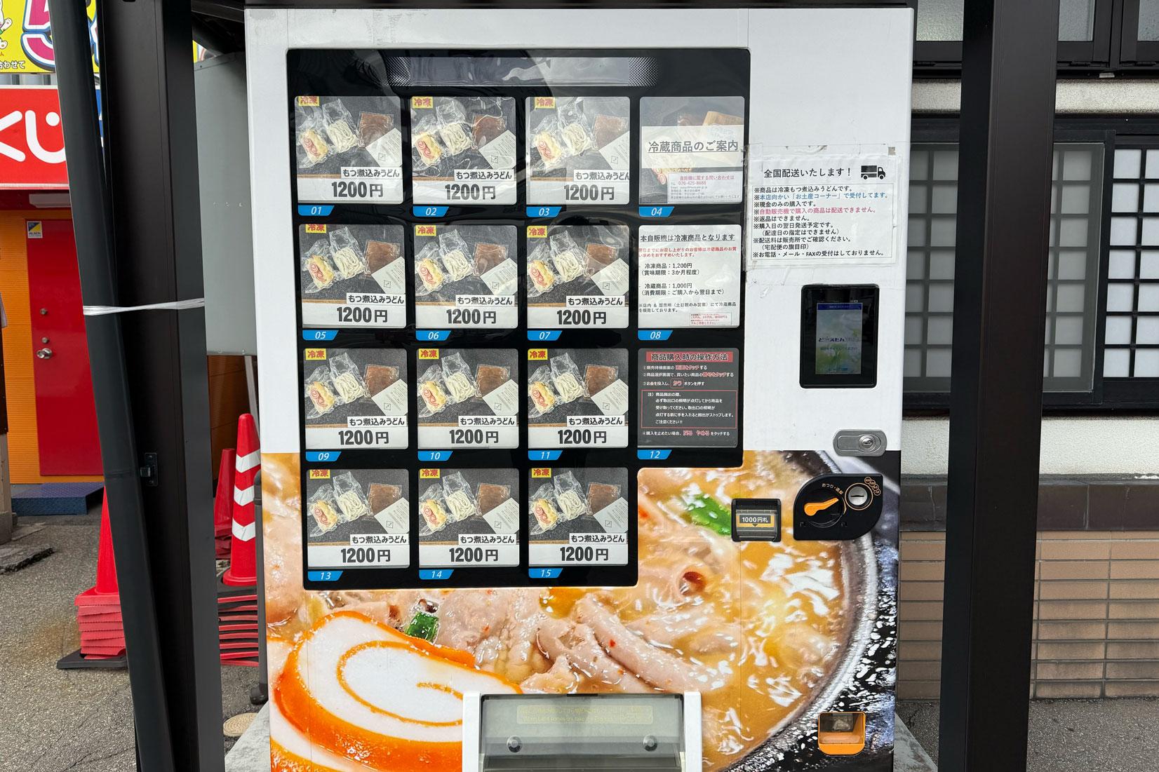 お店の横には24時間営業の自動販売機があり、冷凍の「もつ煮込みうどん」を購入できます。私も買って帰り、野菜を中心に好きな具材を追加して、お店と同じ味を堪能しました。富山市や金沢市にも店舗があるため、小矢部が遠いと感じる方はぜひお近くの店舗へ足を運んでみてください。