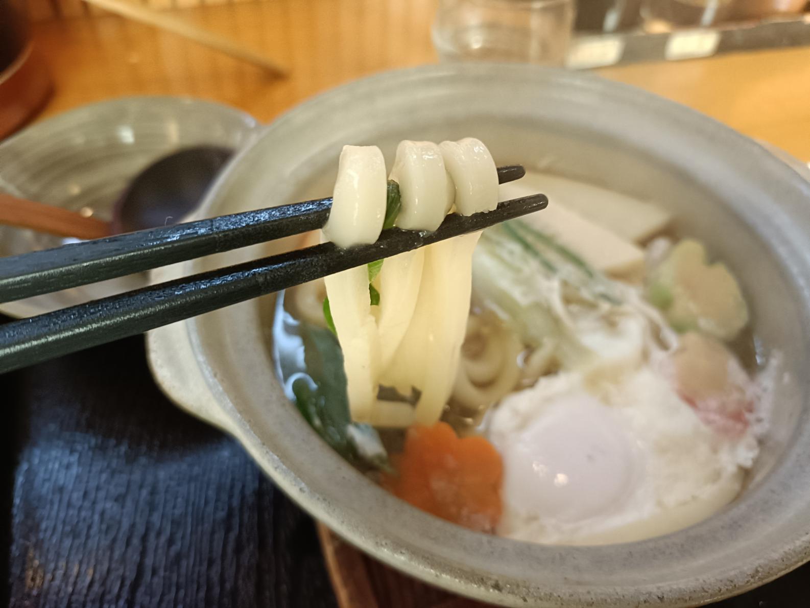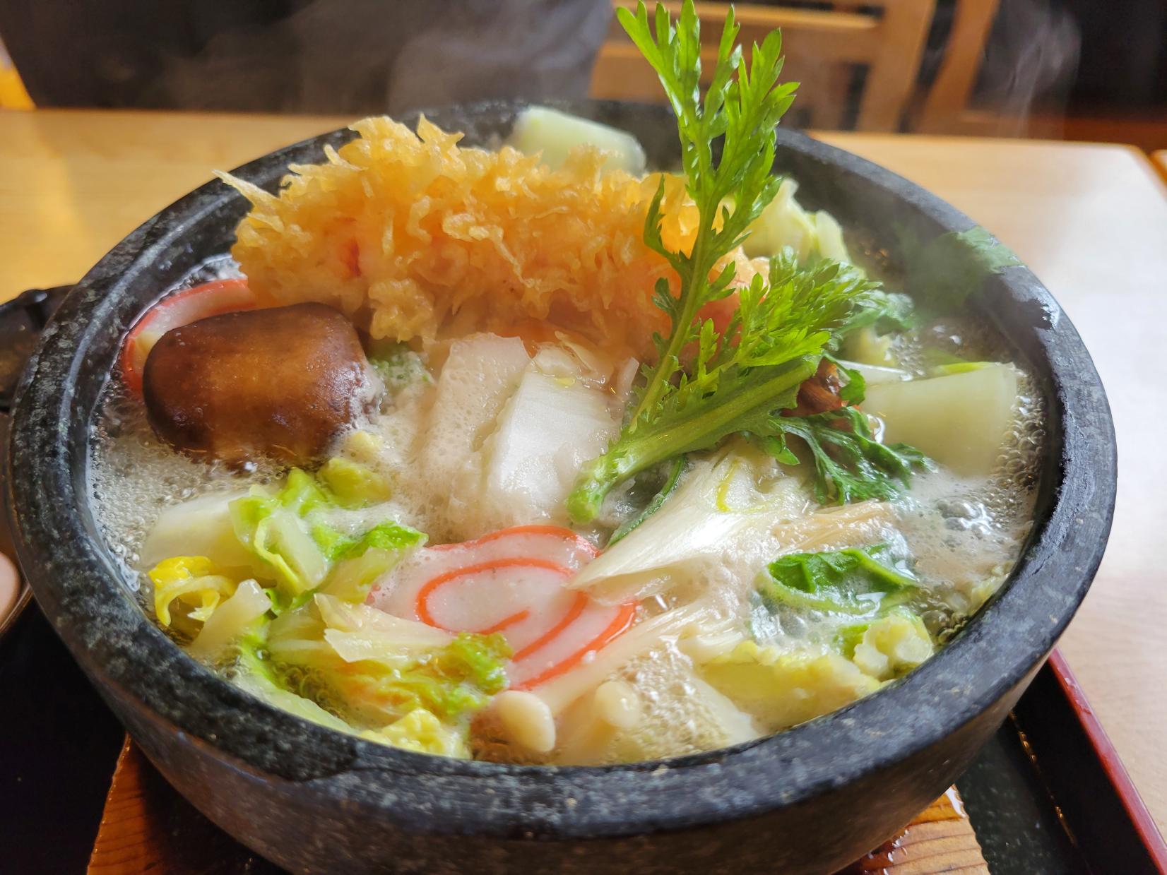 太めの麺に、汁の旨味がしみ込んでおり、食べるたびに幸せな気持ちになりました。もつとうどん以外の具材も充実しており、えびの天ぷら、富山らしい赤かまぼこ、長ネギなどの野菜が入っています。もつの量と共に感動したのが、野菜の多さ。たくさん食べられるので、満足感も抜群です。この煮込みうどんは熱々の鍋に入っているので、最後まで温かい状態でいただけます。夏は、汗をかきながら食べるのがとても美味しく、冬は身体を芯から温めてくれます。季節ごとに食べたくなる味です。