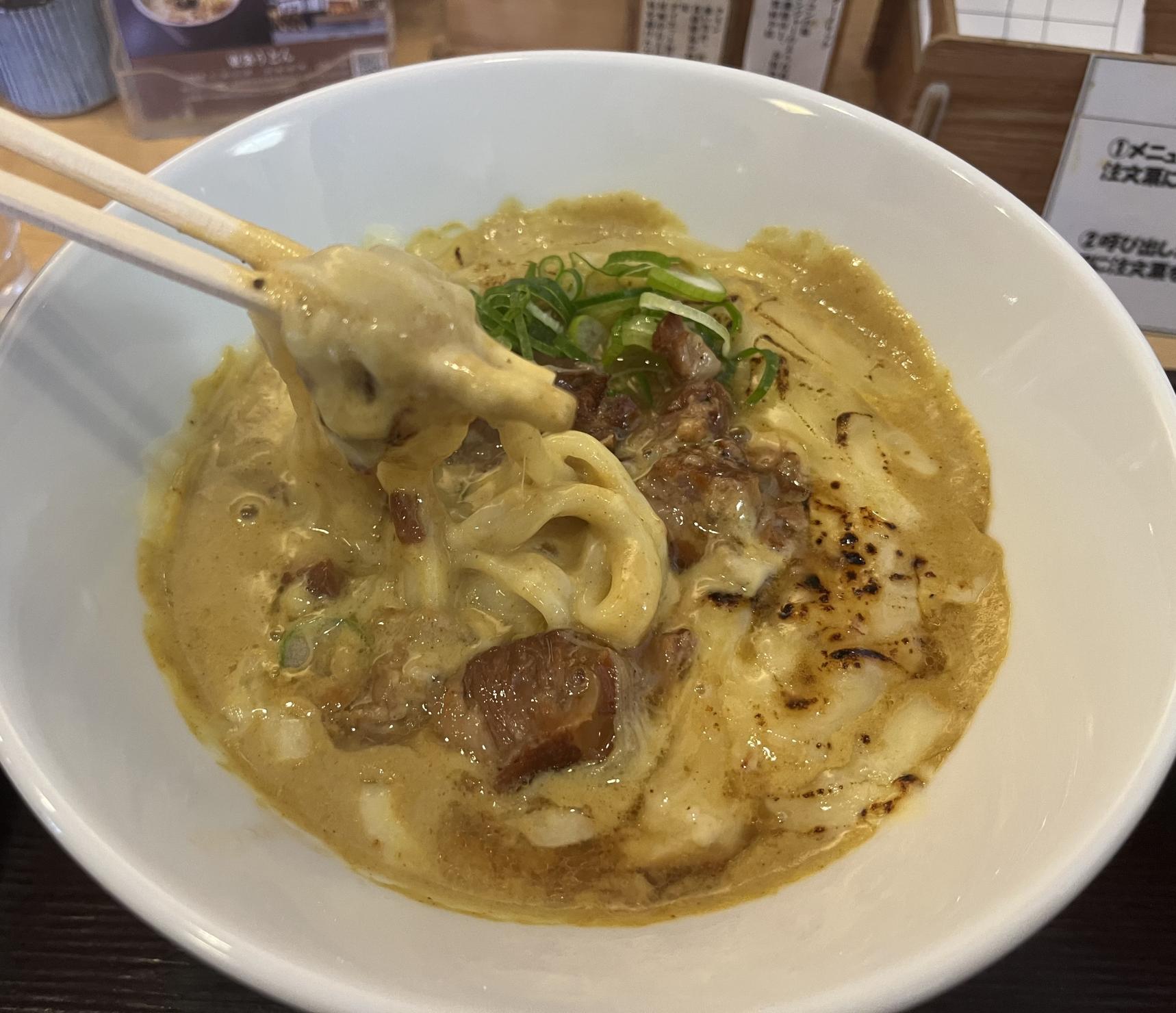 うどんのもちもちっとした食感へのこだわりがあり、手打ちの麺は圧力釜でゆでている。口にすると、たっぷり入った濃厚なチーズとカレーの出汁が太い麺にじっとり絡み合い、ずしりと胃に収まる。具材の甘辛くほろほろと崩れる豚肉が良いアクセントとなっており、箸が止まらない。