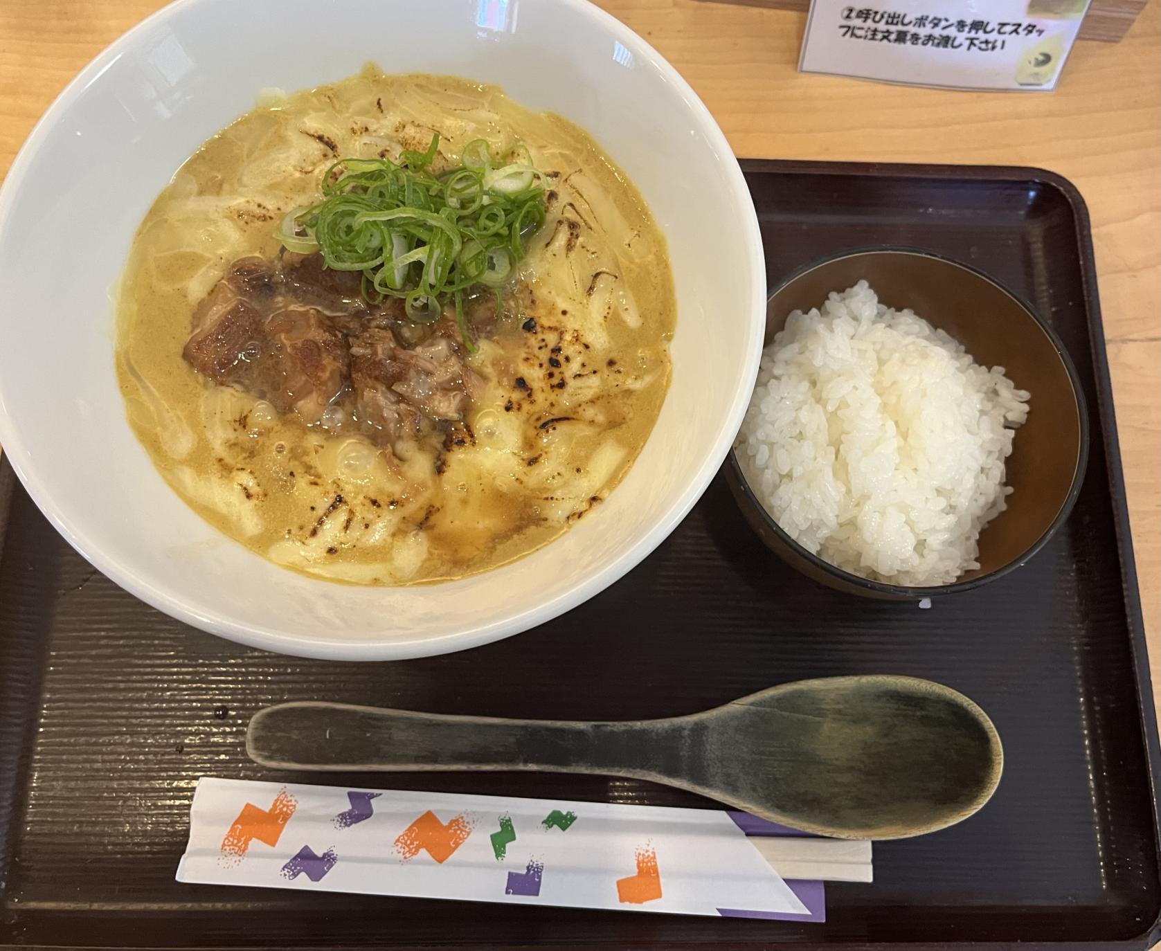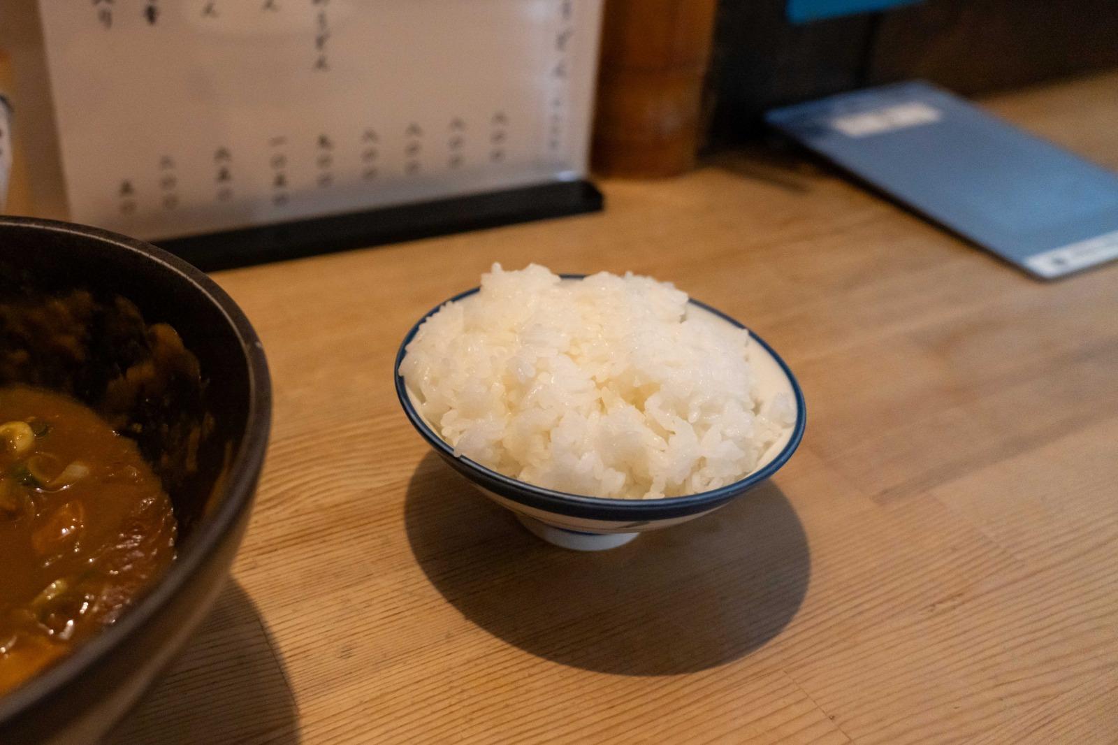 スパイシーなカレーは太めの麺と絡み、箸が止まりません。また、じっくり煮込んで味付けされた鶏肉とサッパリとしたネギもよいアクセントになり最後までペロリと食べられます。そして絶対にやりたいのは、“ご飯”を注文する事!