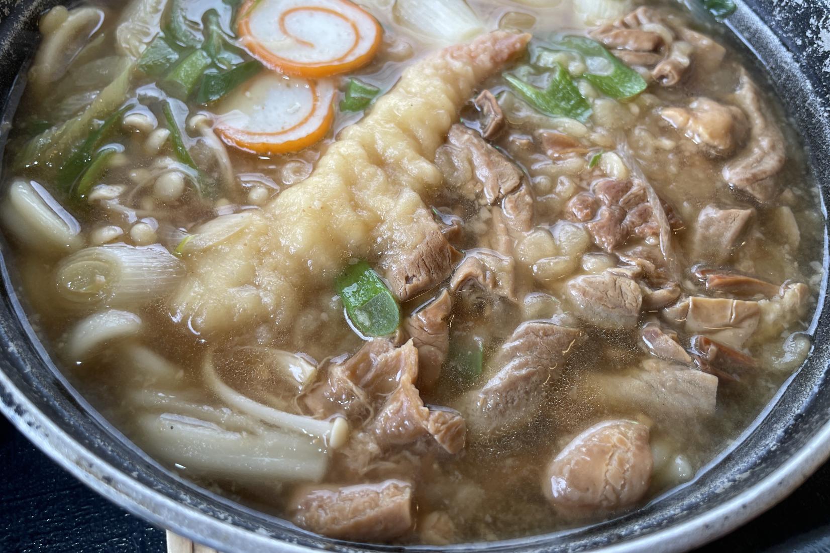 主役のもつはやわらかくて食べやすく、量もたっぷり入っています。うどんは富山の名産、氷見うどんを使っています。