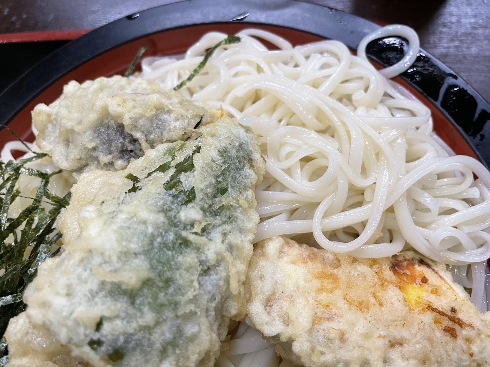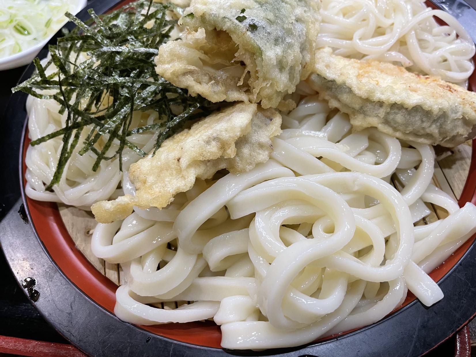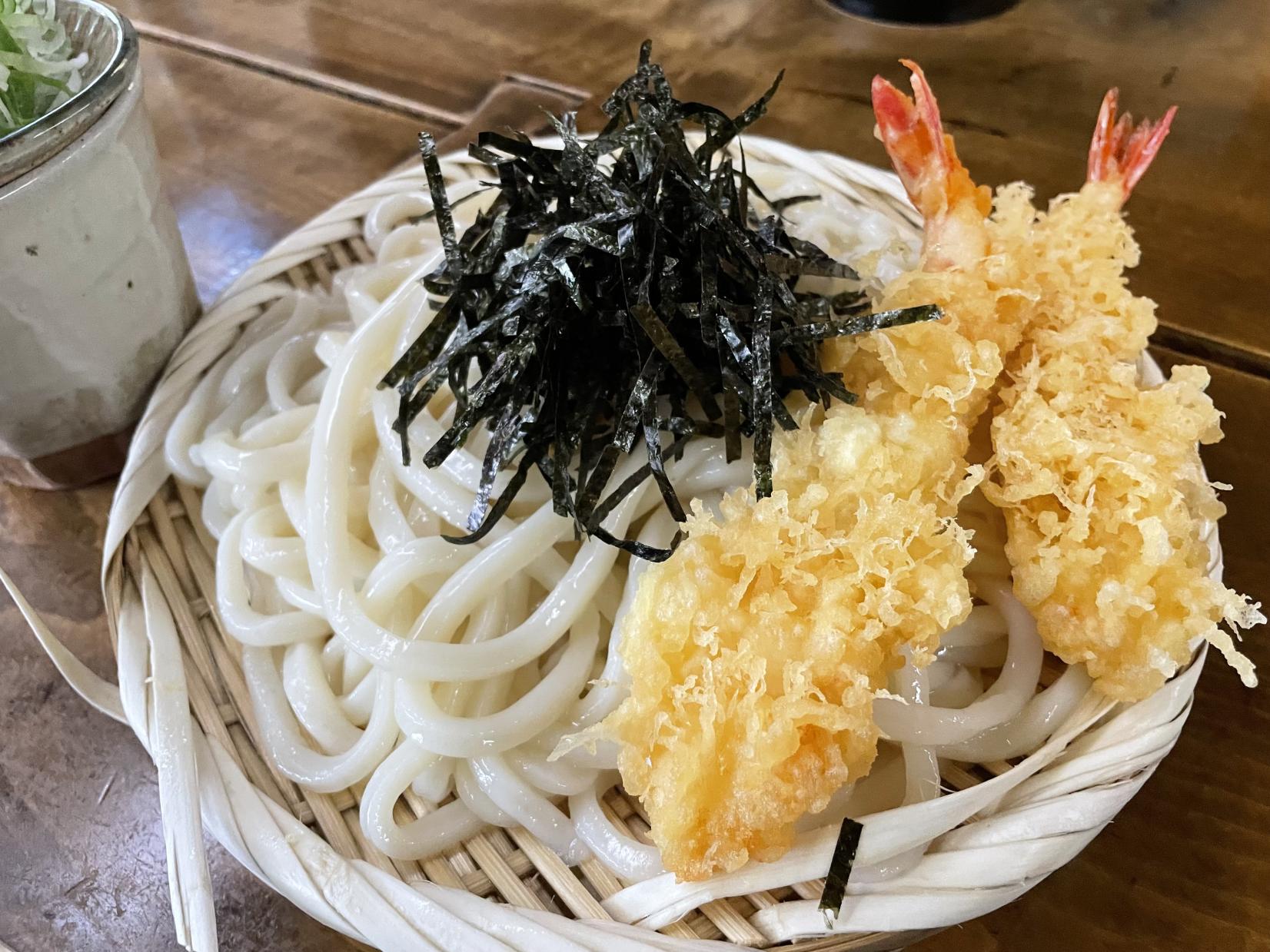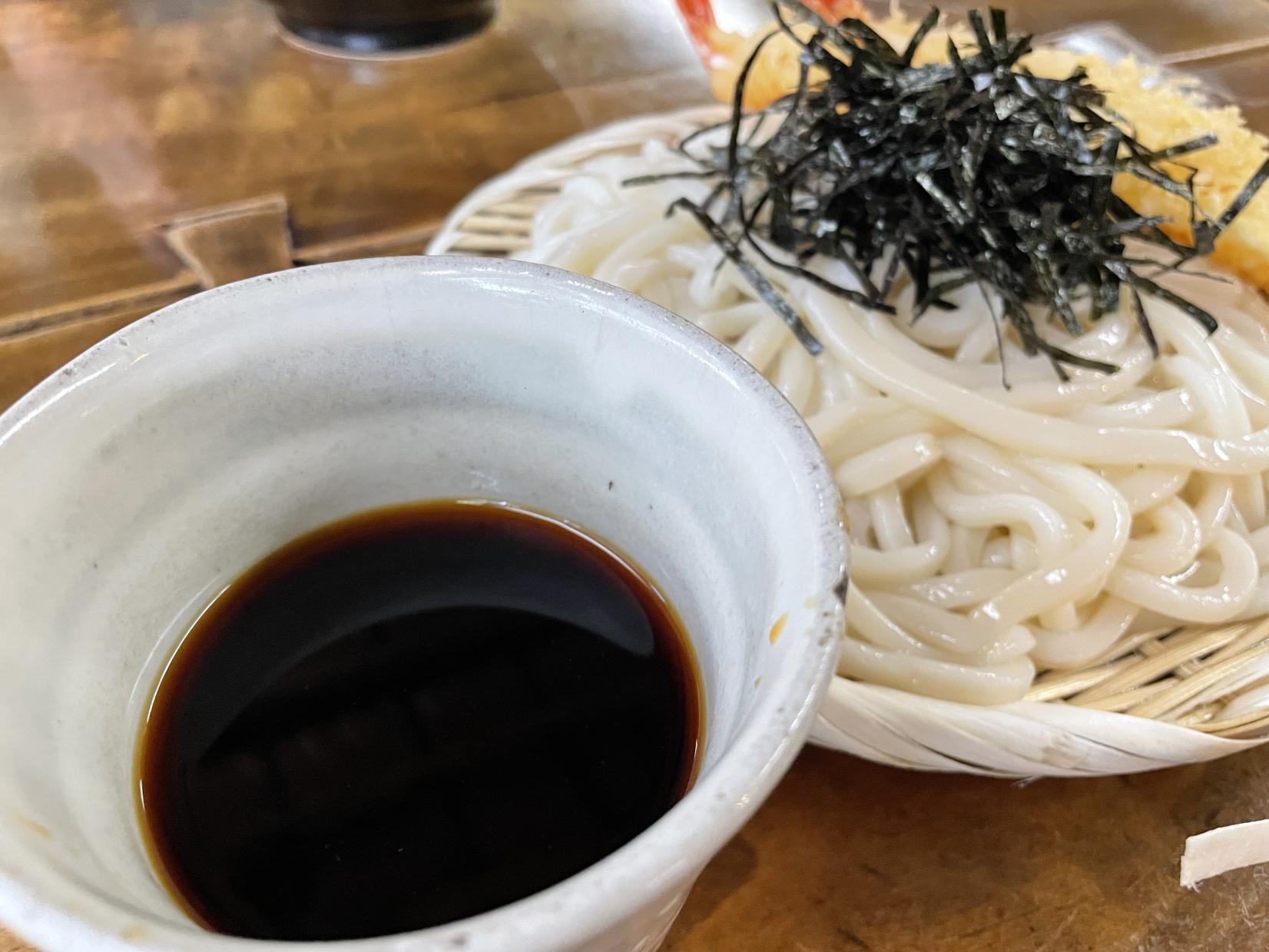 手打ちのうどんは、ツルツルでもちもち、みずみずしい。「天ざるうどん」のつけダレは濃いめの味付けですが、みずみずしいうどんをつけて食べると最後までちょうど良い濃さで楽しめます。