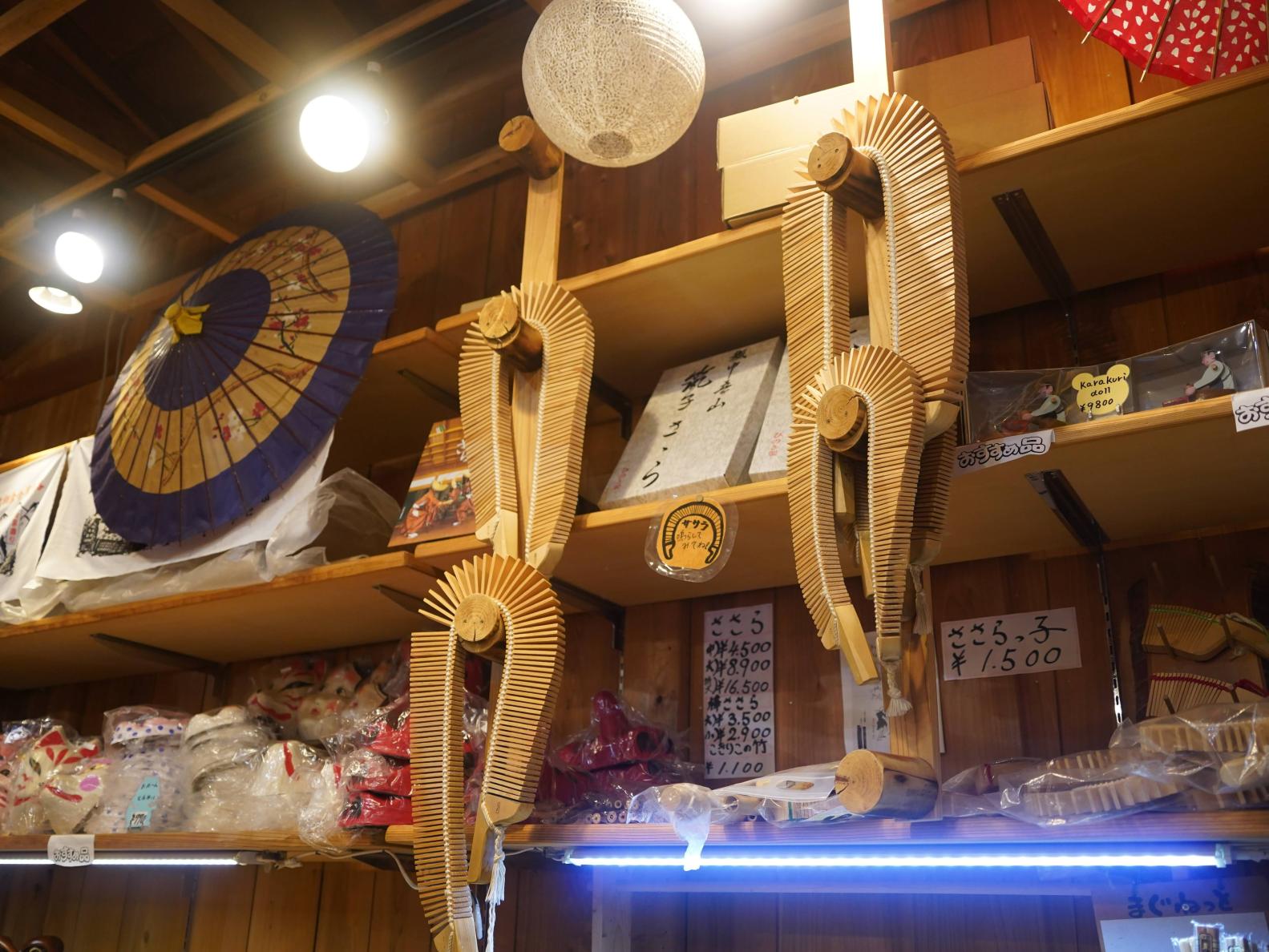 お土産コーナーも充実していて、集落での暮らしでも使われている編笠などユニークなアイテムが勢揃い。五箇山を訪れた記念にぜひお求めください!