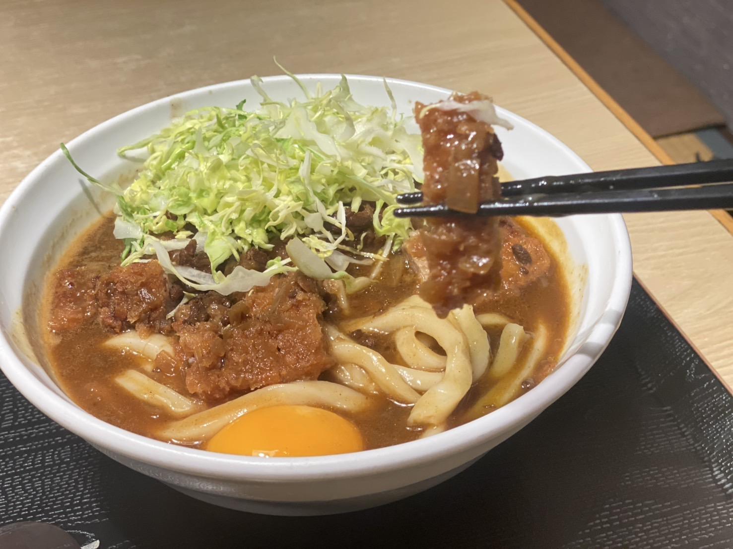 今回選んだのは、根強い人気を誇る「カツカレーうどん」。カレーと出汁がマッチしたつゆがカツにじゅわっとしみ、絶妙な味わいです!ボリュームも味も大満足の一品でした。
