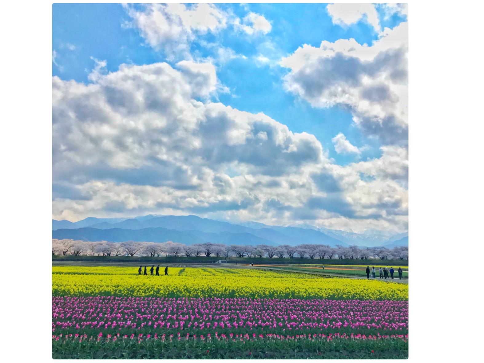 残雪の朝日岳や白馬岳の北アルプスを背景に舟川べりの桜、チューリップ、菜の花の美しい四重奏を楽しむことができる、富山の春No.1映えスポットと言っても過言ではない桜の名所です。