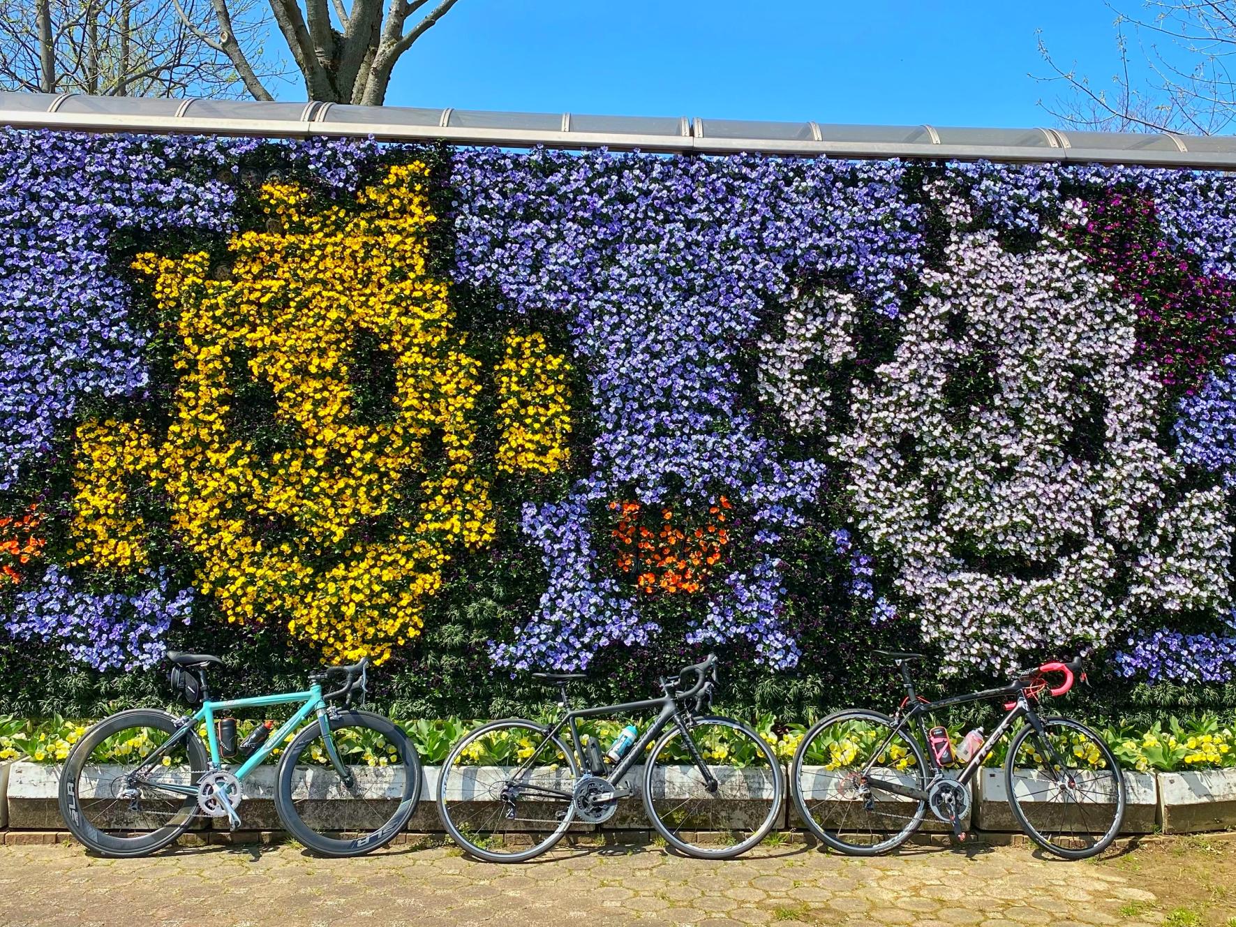 正門にはビオラであしらわれた巨大な花の絵「フラワーウォール」がありバイクと一緒に撮れる映えスポットです。