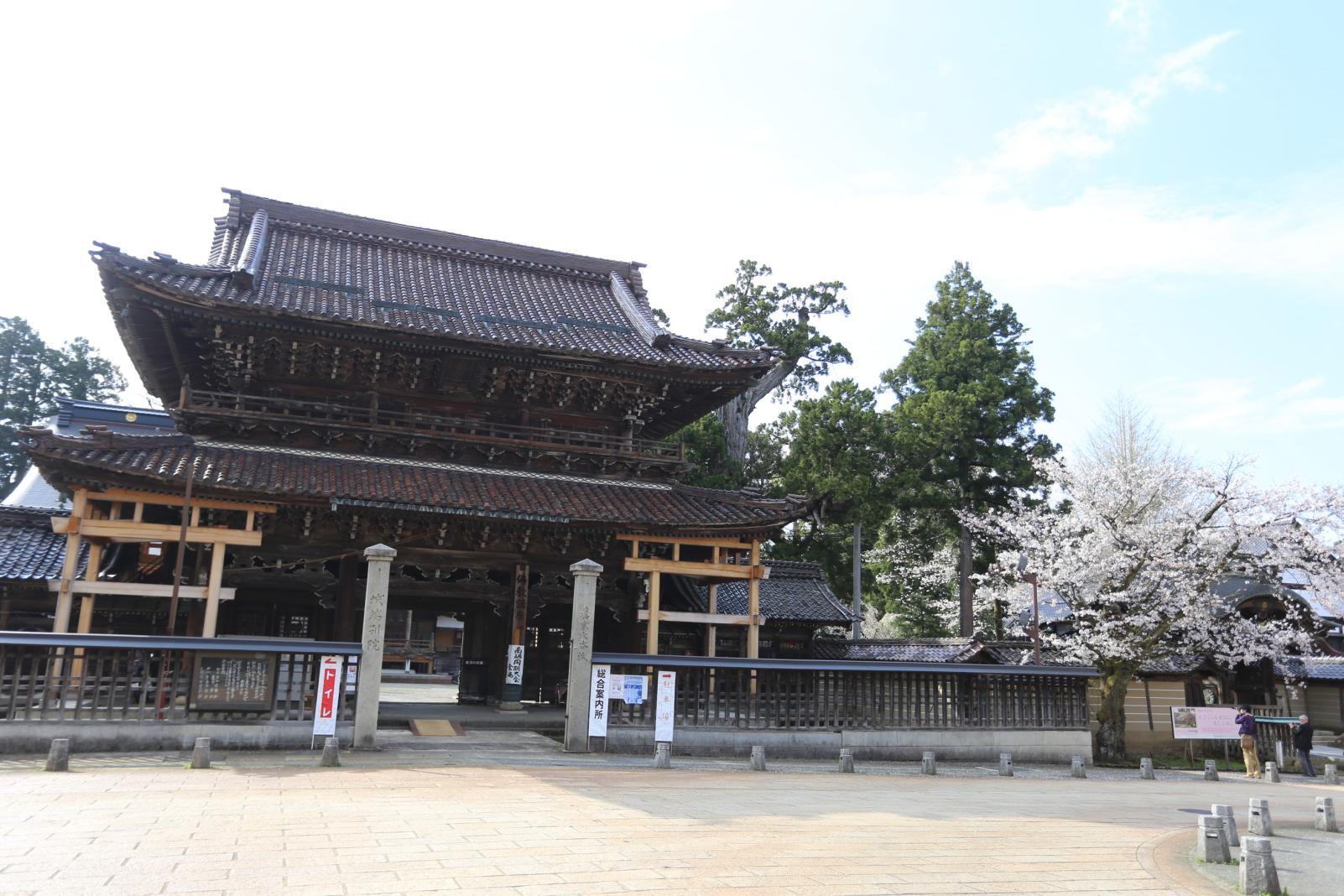 城端別院 善徳寺には樹齢350年になるしだれ桜(糸桜)があります。 この桜が咲く期間だけ、式台門という格式ある門が一般開門され、桜越しに見る式台門を求めて多くの人が訪れます。