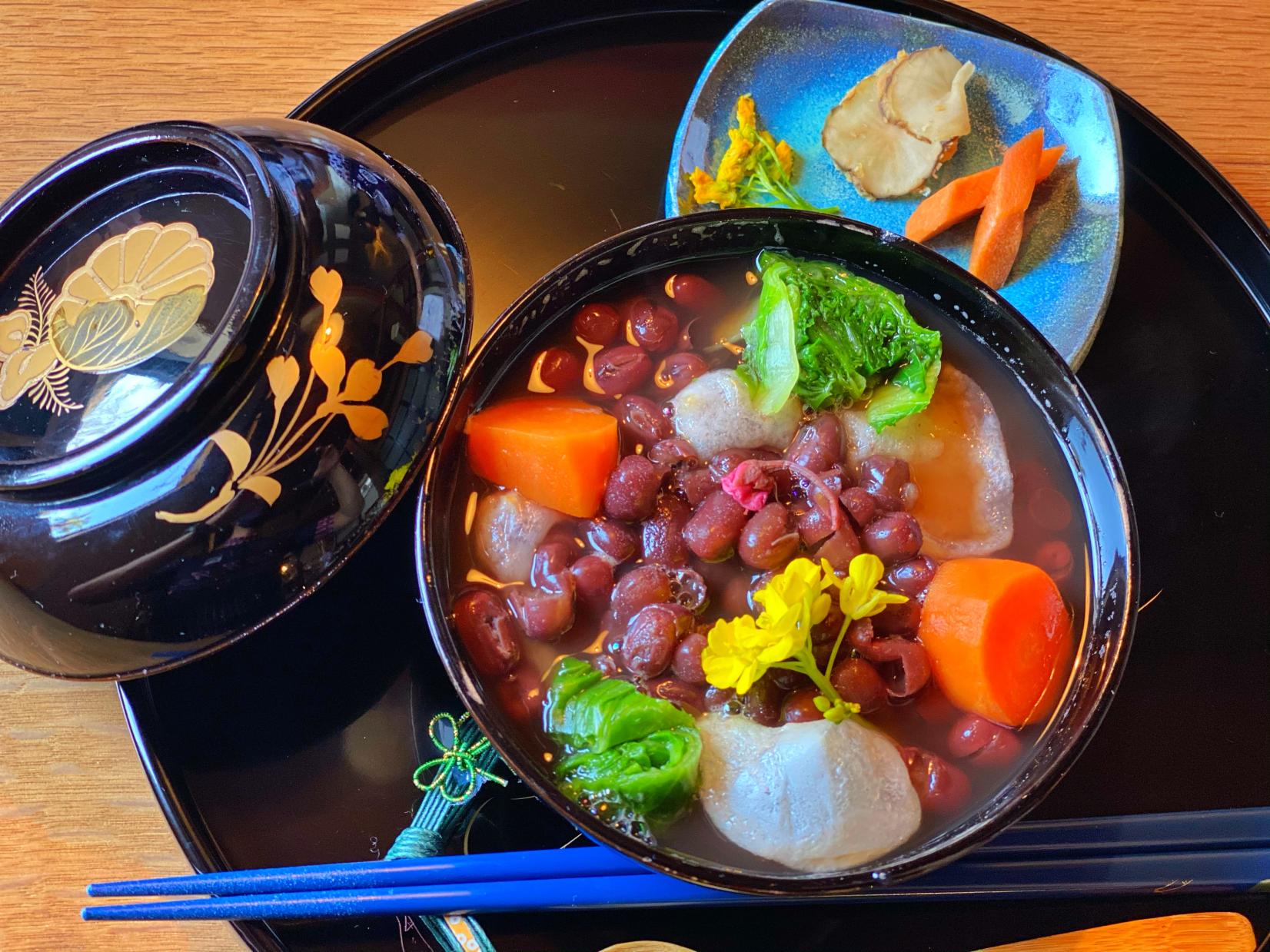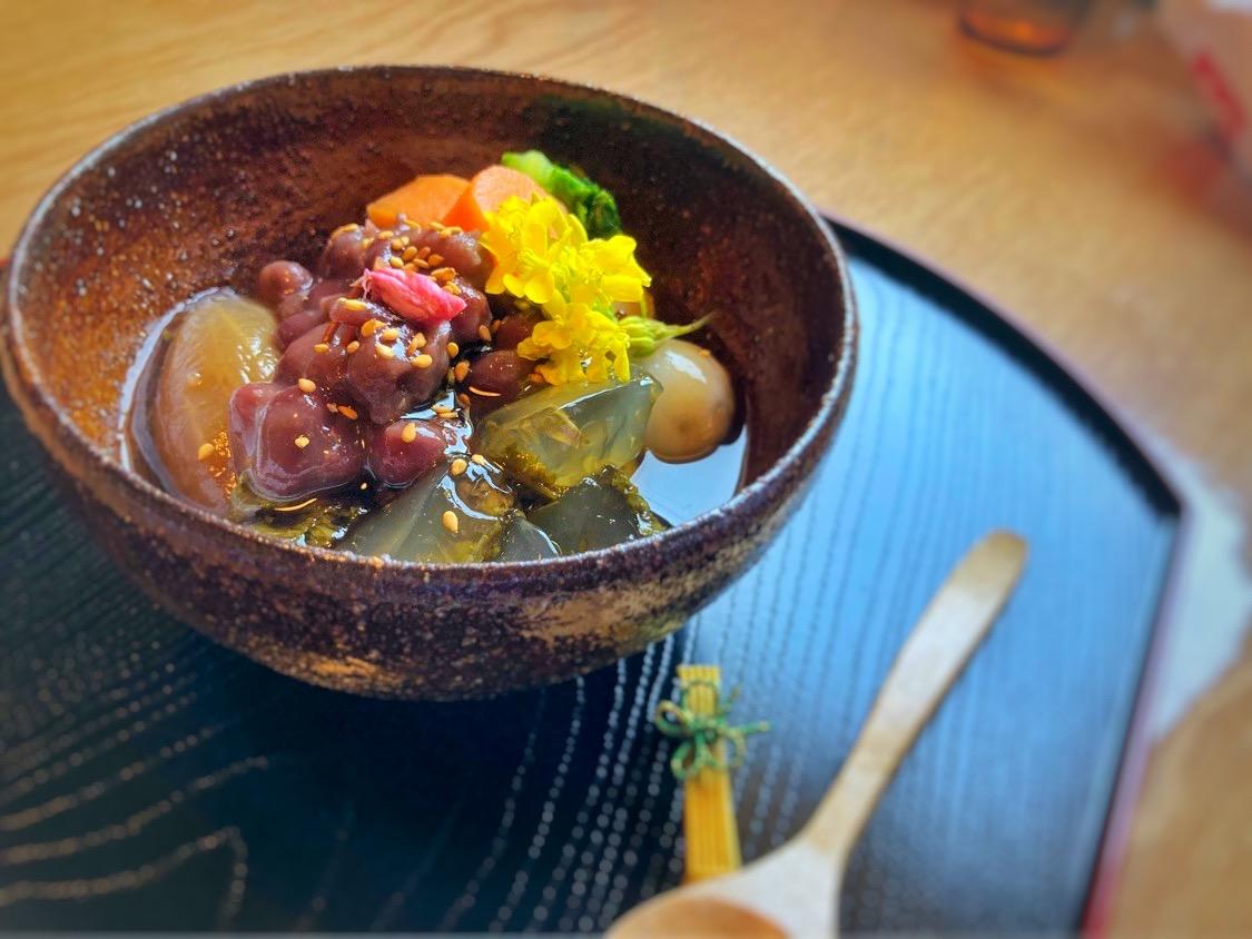 「城端の玉手箱」は名前通りの色鮮やかで野菜を使った珍しいぜんざい。ランチは要予約で「おばんざい」(寄席豆腐に小鉢5品)が食べられます。