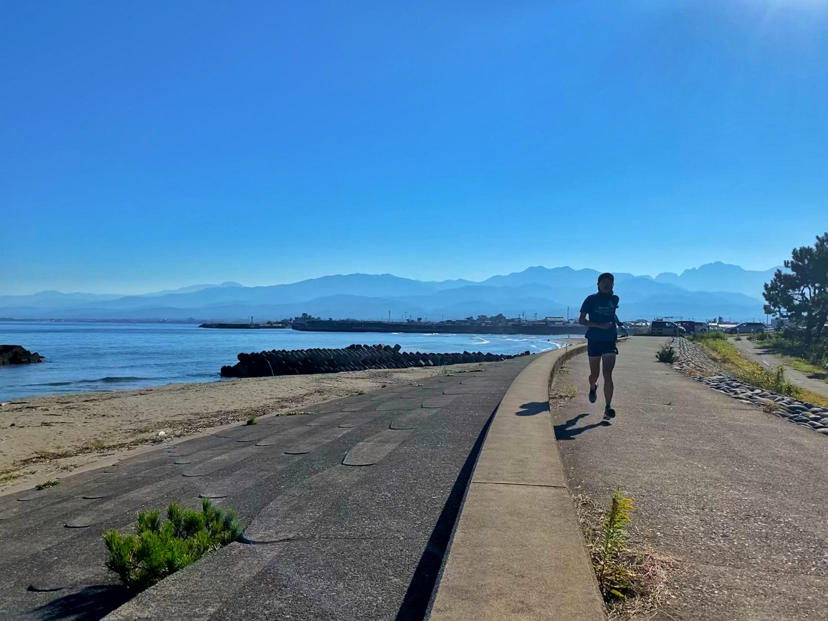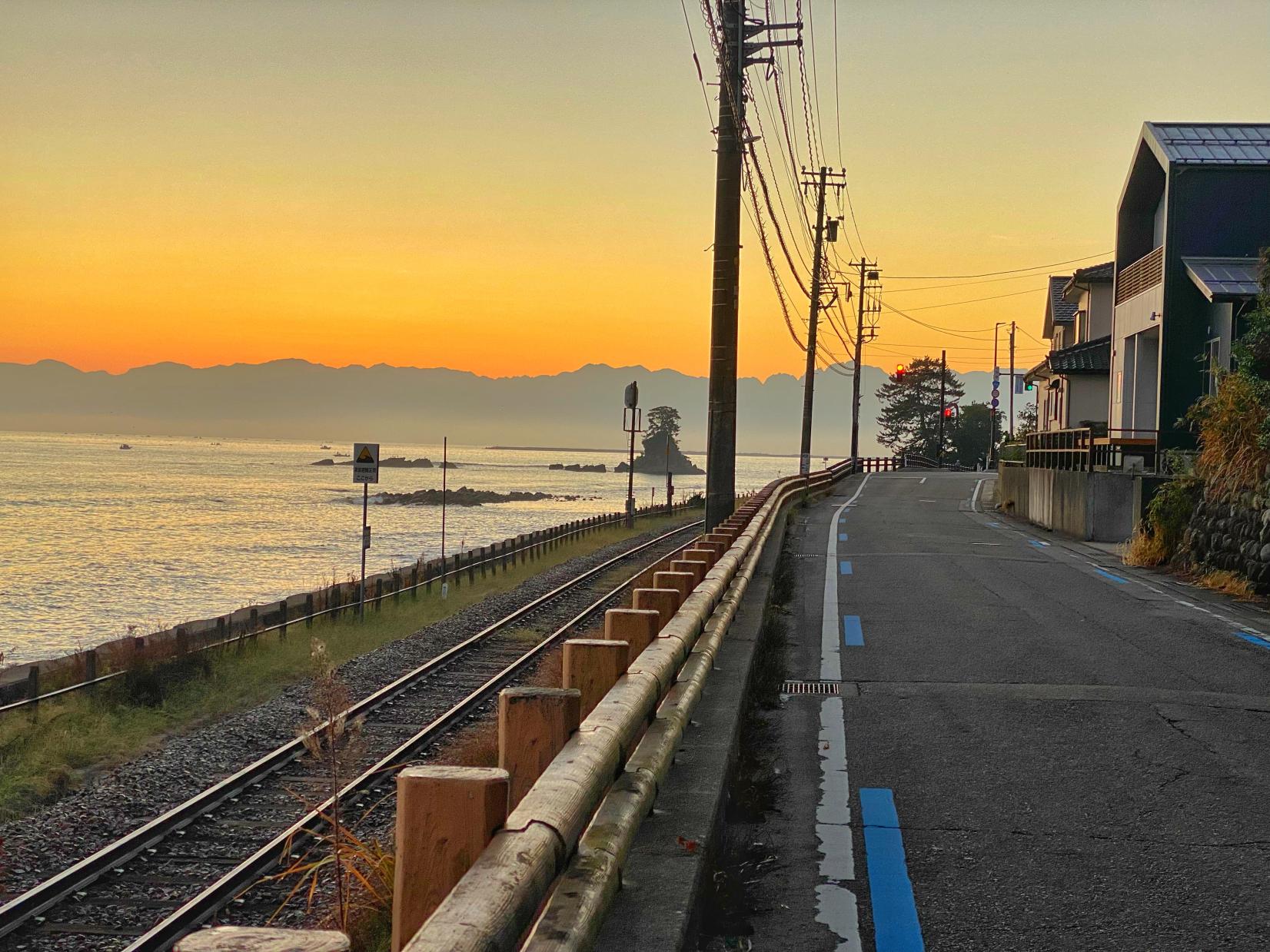 雨晴駅をスタートし伏木港を往復するコース。海岸から立山連峰が一望できる景色は壮観。海越しに3000m級の山を望むことができるのは世界でもここだけとか。厳冬期の快晴の早朝には毛嵐(けあらし)と呼ばれる海水面に立ち上がる霧が発生し幻想的です。