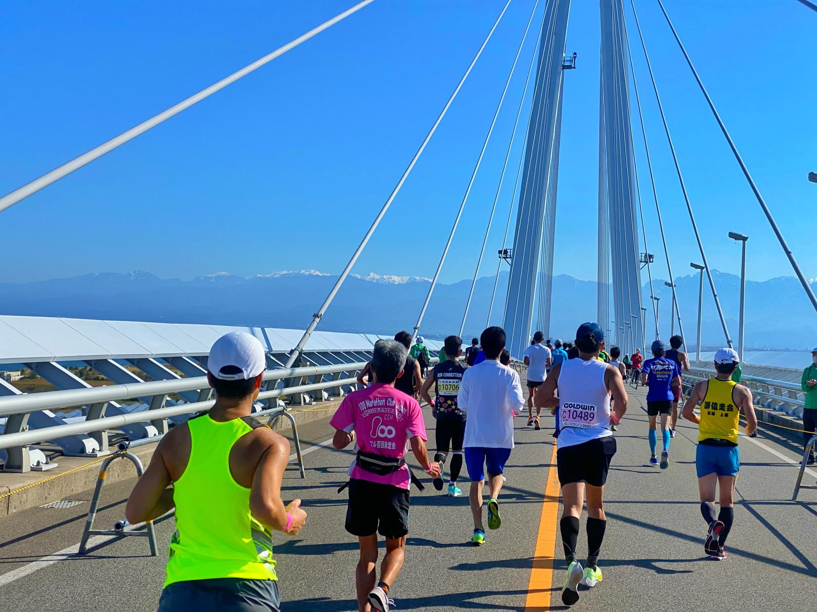 絶景の新湊大橋を自分の脚で渡れるのは、この富山マラソンだけ!この大会でしか渡れません。