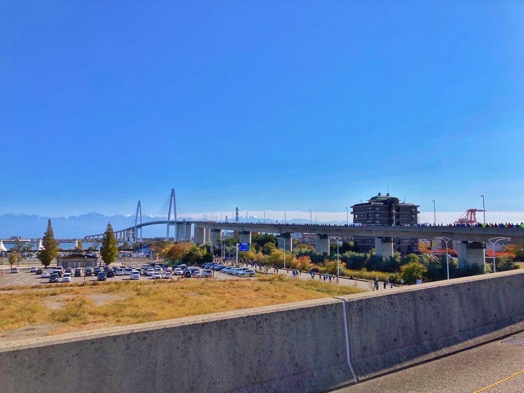 県外の参加者でたまに勘違いされる方がいますが「奈呉の浦大橋」です。新湊大橋は3km先に小さく見えているツインブリッジの橋です。