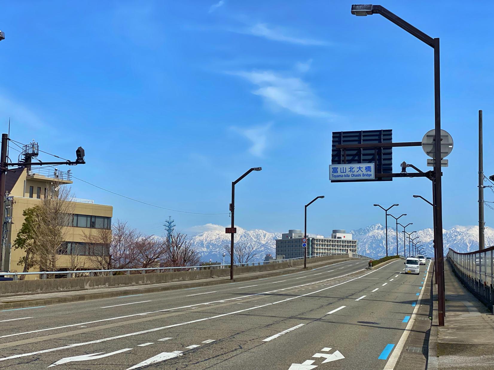 一級河川の神通川に架かる富山北大橋を走る途中、ビル群越しに雄大な立山連峰が望めます。