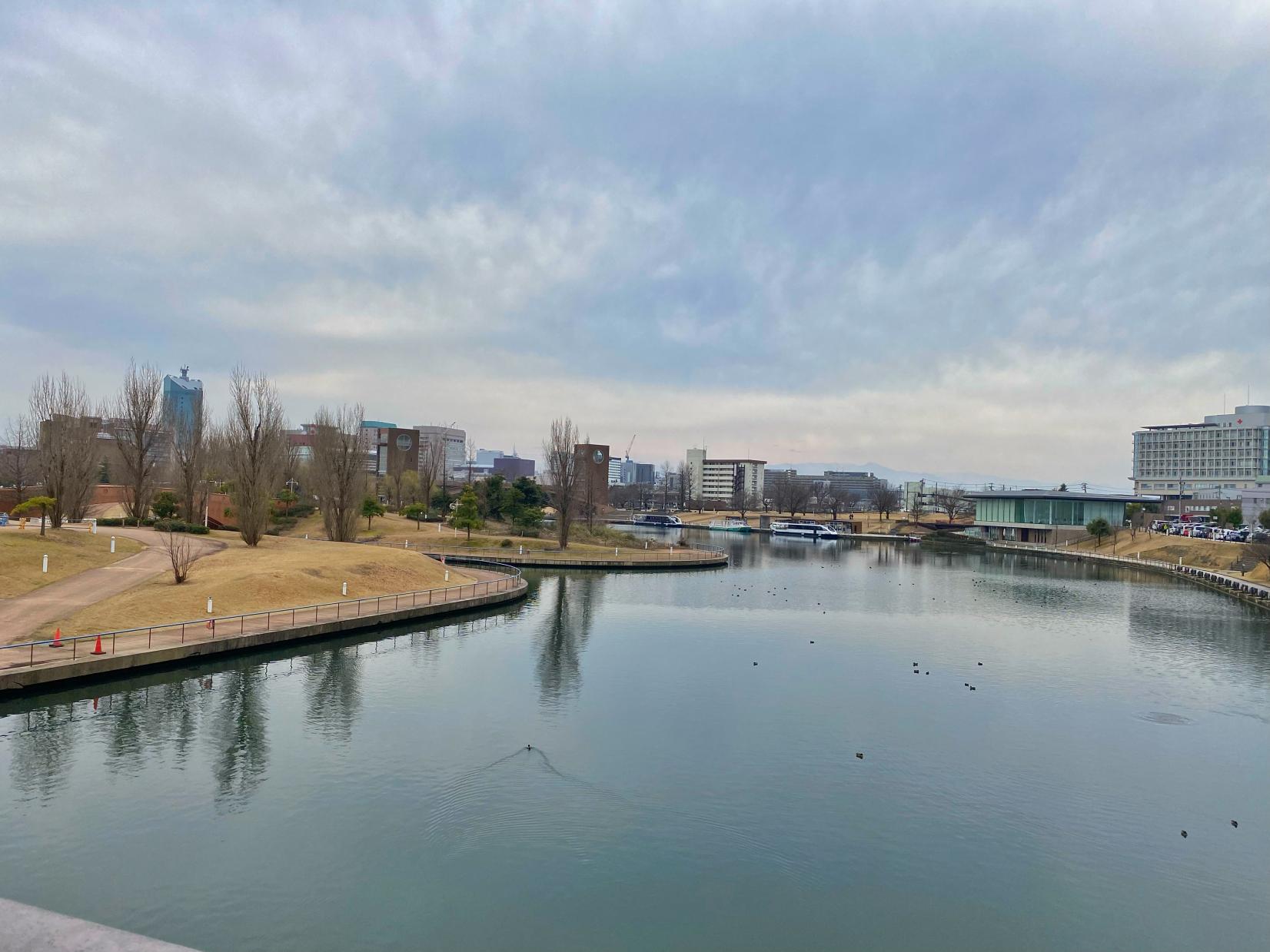 富山県美術館の横を通り、富岩運河環水公園が見えてくると、もうすぐゴールです。
