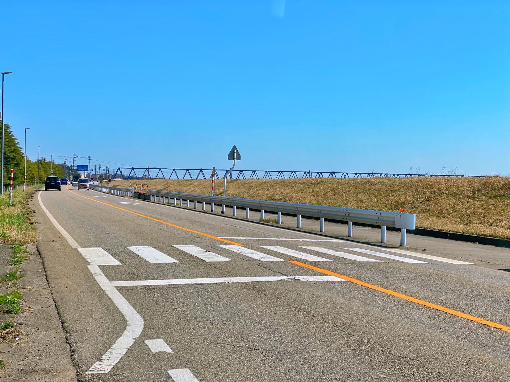新湊大橋は全長3.6km、高さ47mを上るコース最大の難所です。