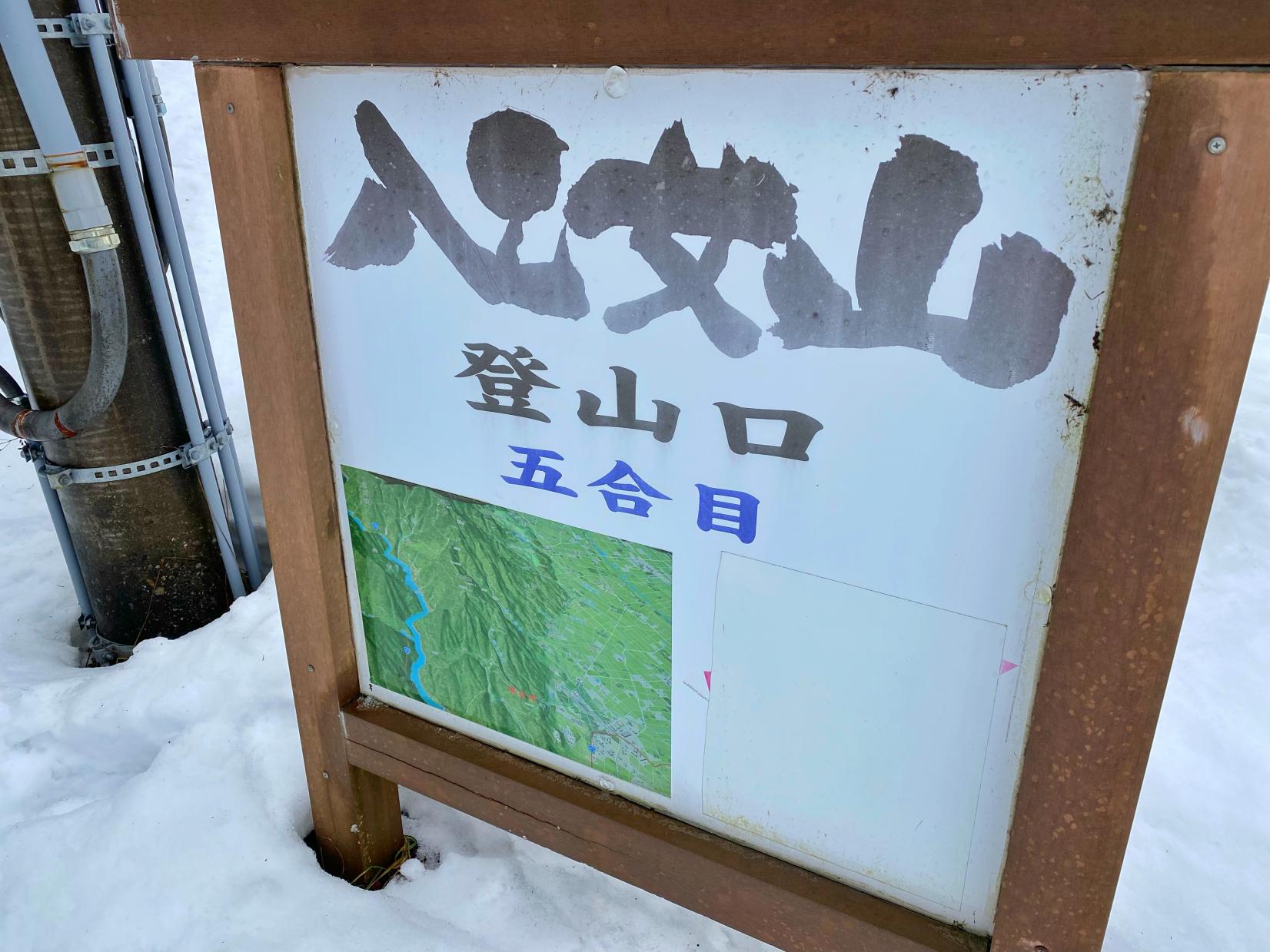 展望広場を過ぎるとすぐに登山口の案内板があります。登山口でもう5合目となりますが、まだまだ序盤です。