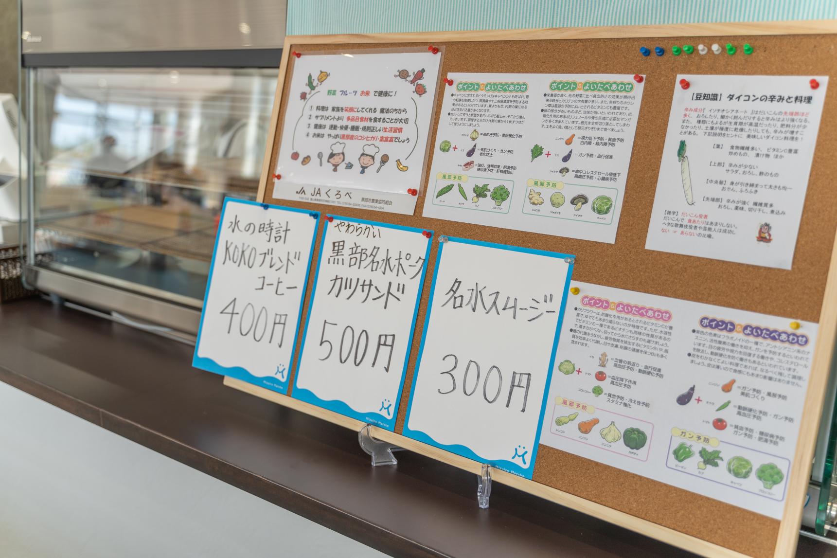 地元の食材を使った「黒部名水ポークカツサンド」や「名水スムージー」、水出しコーヒーで有名な水の時計さんの「KOKOブレンドコーヒー」など、ここでしか味わえないものがいっぱいあります!