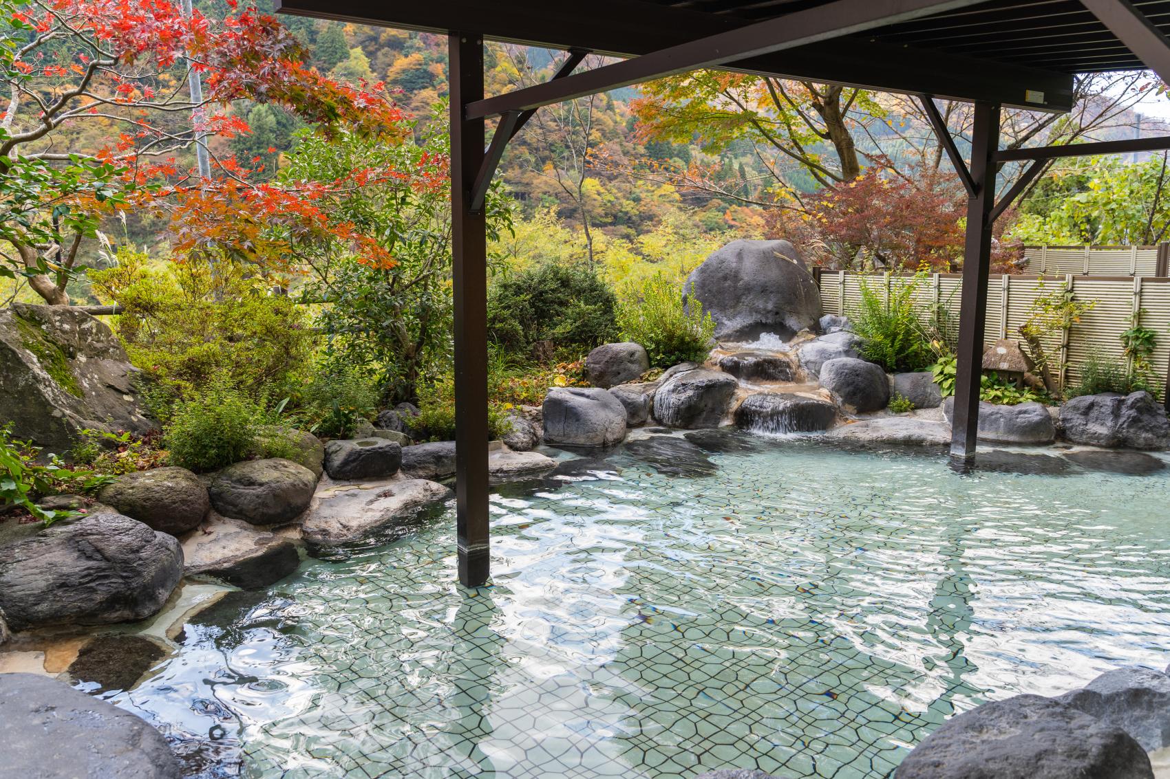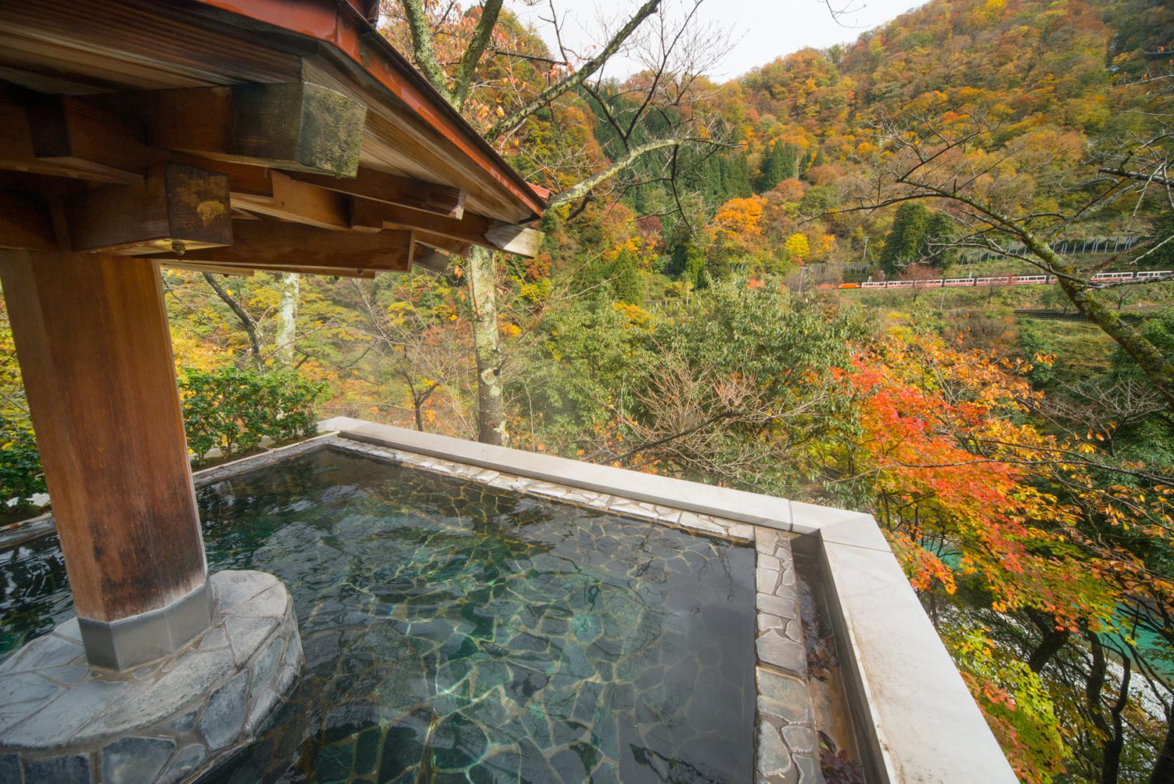 こちらの露天風呂はなんと対岸に走るトロッコ電車を見ることができます!