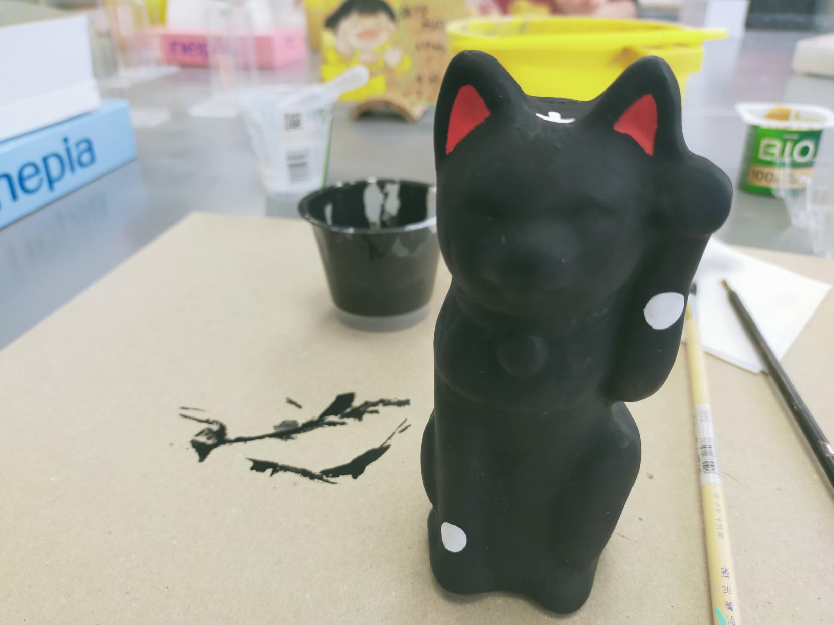 素焼きの土人形はあらかじめ白色に塗ってあるので、模様を描くだけでも完成します。私は黒猫にしたいので、まずは人形全体を黒色に塗りました。乾いてから次のパーツを描いていきます。