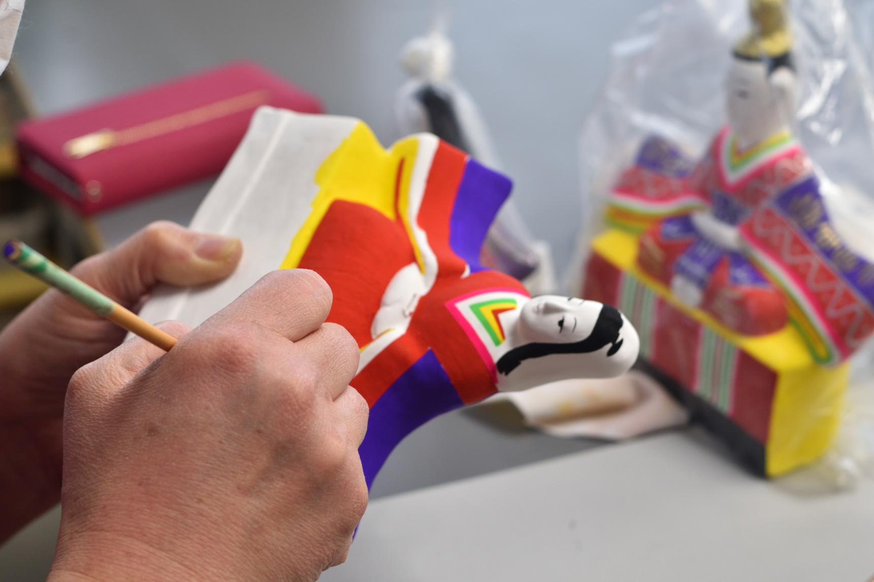 型入れ、素焼き、下塗り、着色の工程を経て土人形が出来上がります。技術の習得には長い年月がかかるそう。体験するのは着色の工程だけですが、型入れ~下塗りまでとても手間のかかる工程なのです。