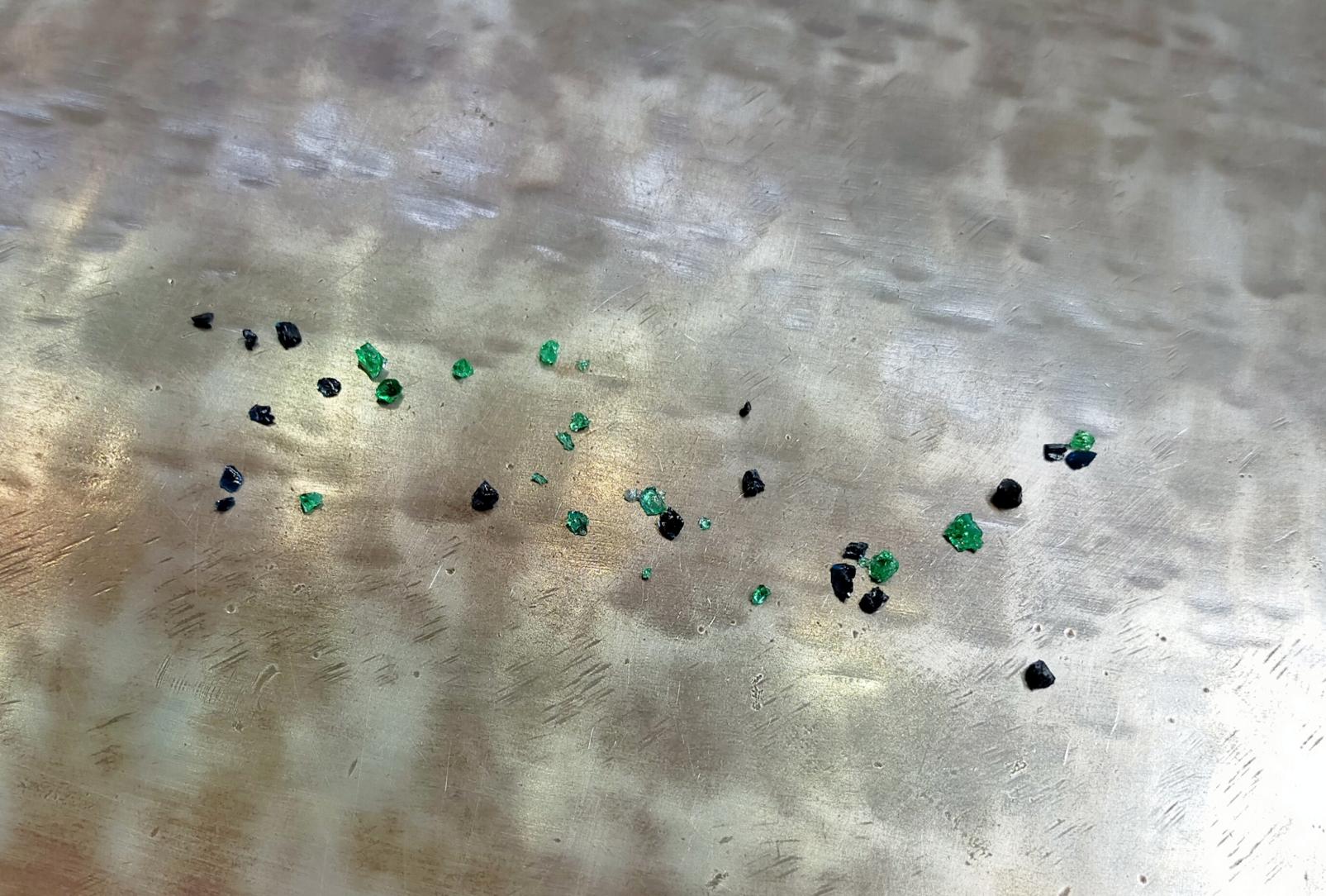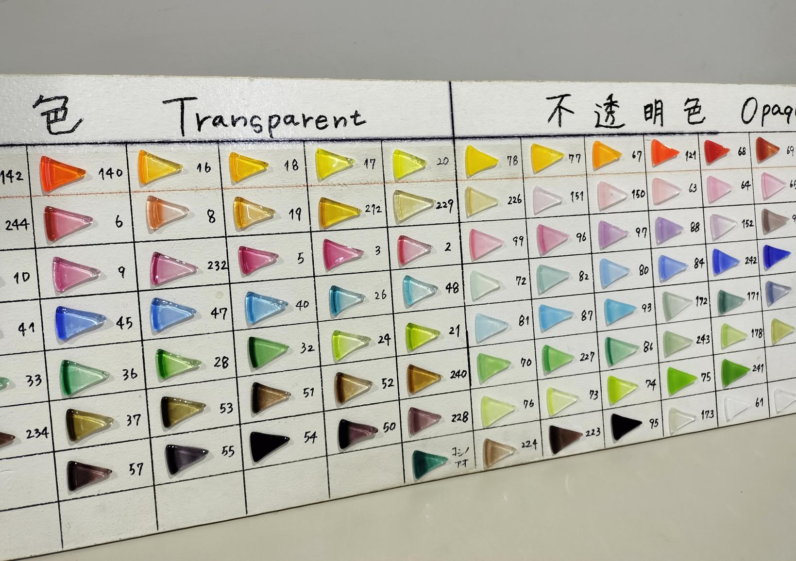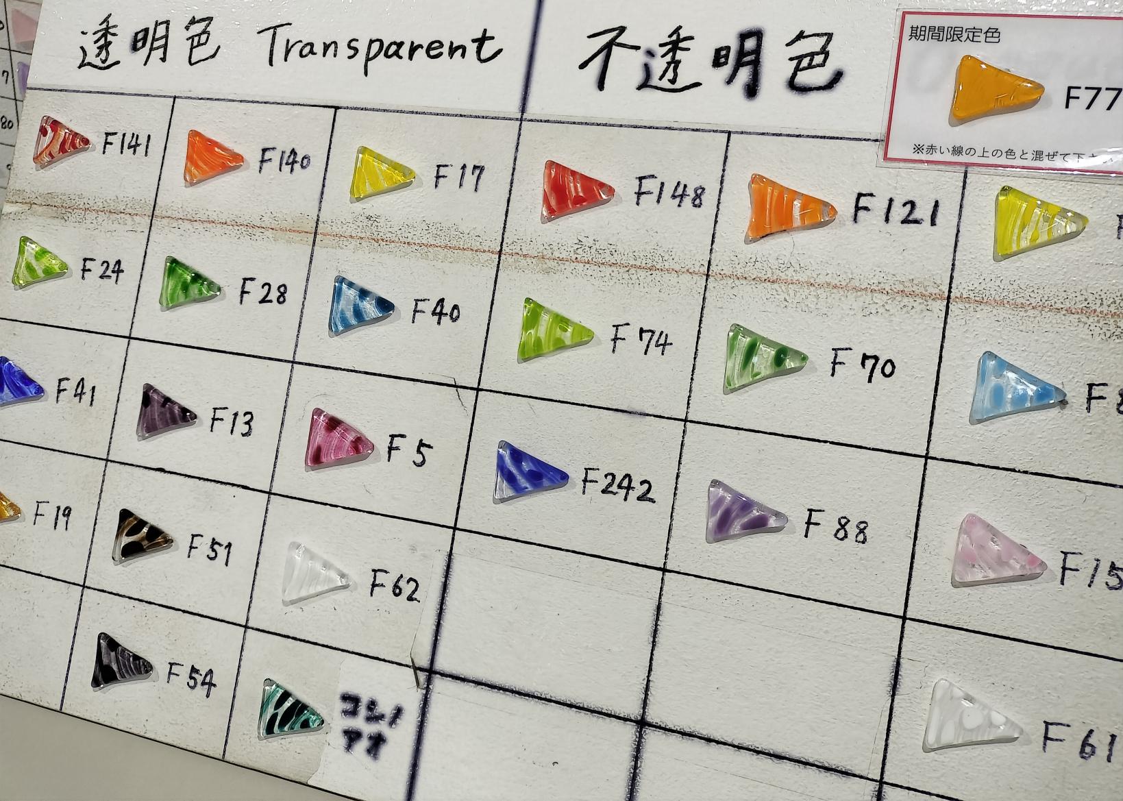 そして最後は模様に使う色を決めます。富山ガラス工房では「富山曼荼羅彩(とやままんだらさい)」というオリジナル色ガラスを開発しており、体験では越碧(コシノアオ)、越翡翠(コシノヒスイ)を選べます。どちらも富山らしいとても素敵な色!今回はこの2色とも選びました。