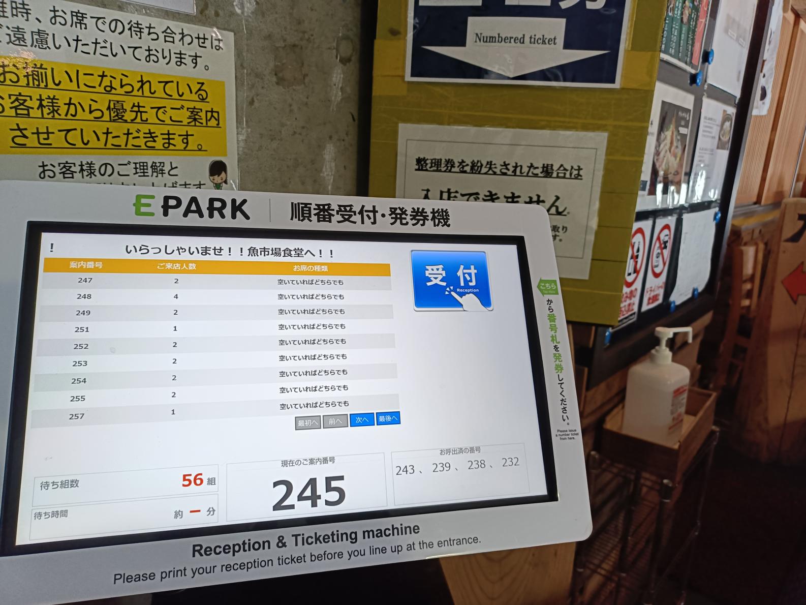 お店の開店は朝の6時半ですが、混雑を予測して開店1時間前に到着しました。まだ扉は閉まっていて中には入れずしばらく外で並びました。6時になると扉が開いたので、2階へ上がり、店前で受付を済ませます。