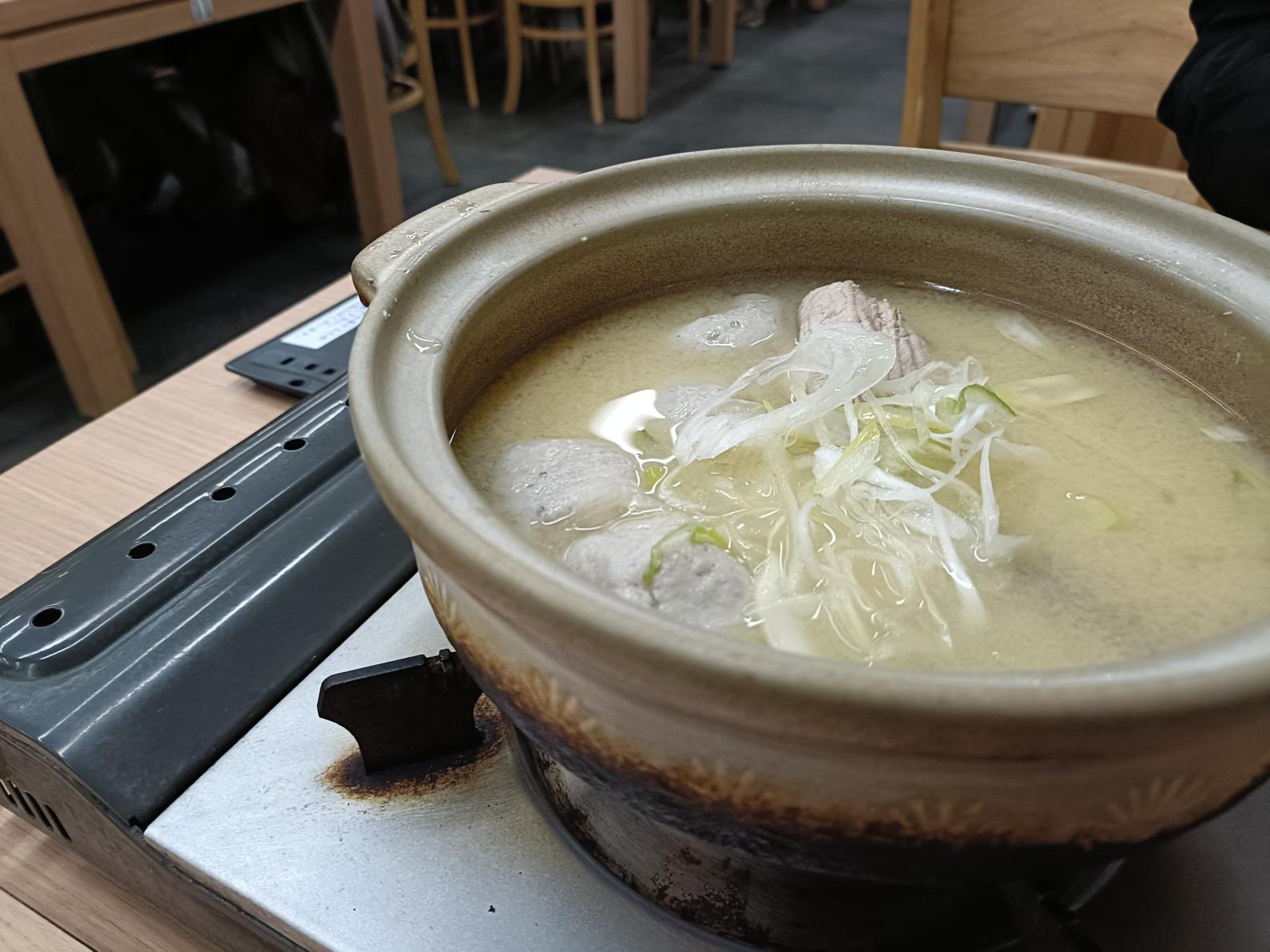 しばらく待つと鍋が運ばれてきました。定食には必ず漁師汁がつきます。漁師直伝の土鍋を使った「漁師汁」は温かいだし汁に魚のあら、大きな魚のつみれが入っていてボリュームがあります。熱々で体があたたまりました。