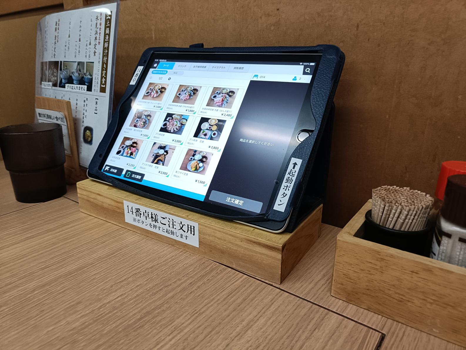 席についたらメニューを決めてタブレットで注文します。水もセルフサービスで、時間の無駄がなく、とてもスムーズです。