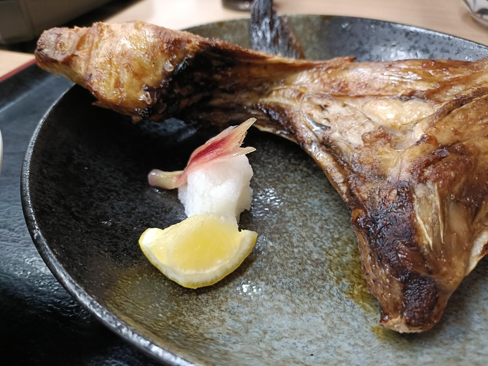 寒ブリ丼は、刺身と炙り、中央にぶりトロがのっています。ぶりカマ焼きは身がふわふわで柔らか。
