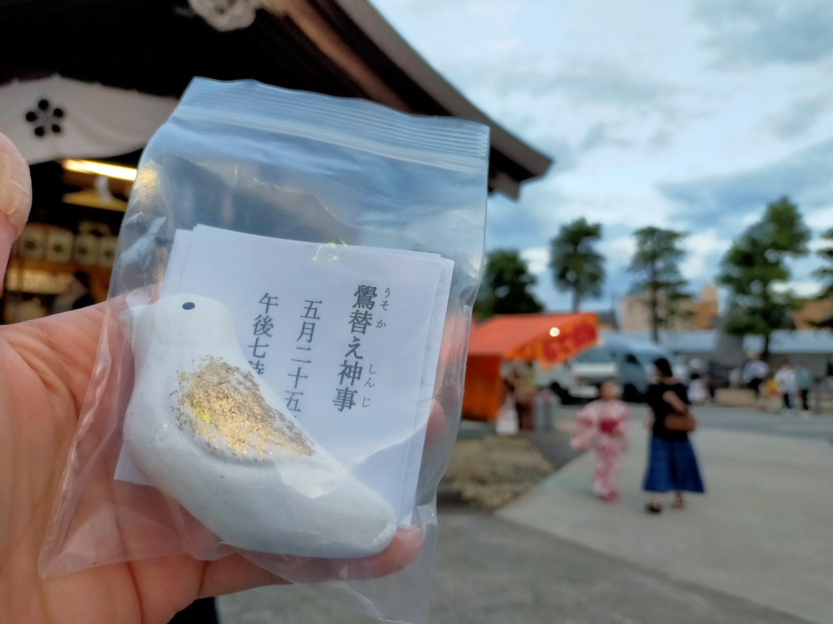 5月25日の春季例大祭には「鷽(うそ)替え神事」が行われます。鷽(うそ)は菅原道真に縁のある鳥で、幸運を招く鳥と言われています。神社で頒布される「鷽の土人形」を「替えましょう替えましょう」と言いながら、どんどん取り替えていきます。これまでの災いを嘘にして、吉に取り替えて幸運をいただく神事です。土人形には番号がついていて、神事の最後に行われる抽選会も楽しみの1つ。参加型のとっても楽しい神事です。