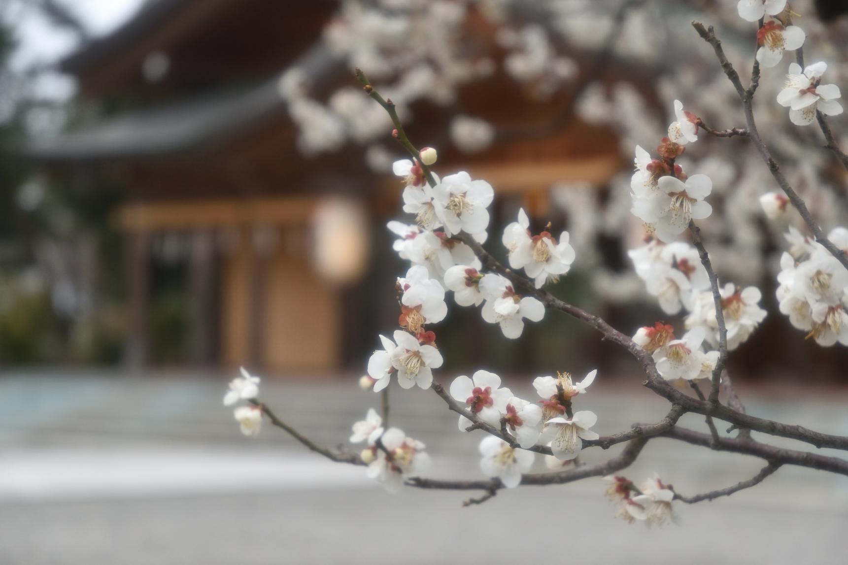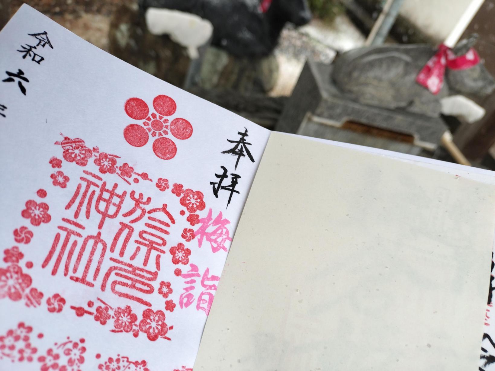 梅の季節には、境内の梅が静かに咲いています。天神様は梅を愛で、多くの和歌や詩文を残したそうです。季節限定で梅詣「御朱印」をいただけますよ。