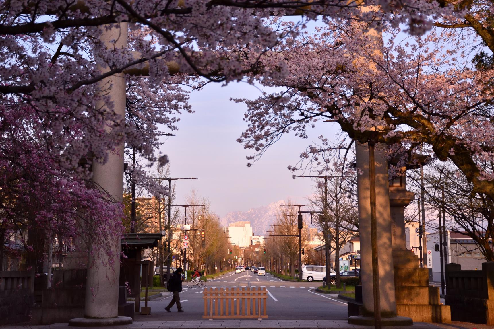 神社から真っ直ぐ伸びる道路は「平和通り」。ここからは大きな銀杏並木が立山連峰とコラボする富山の日常が絶景です。