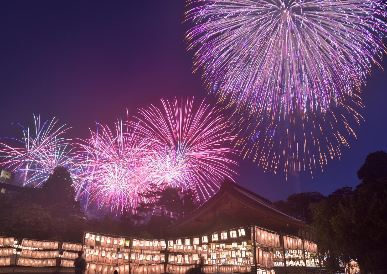 毎年7月31〜8月1日に行われる「万灯みたままつり」は英霊のみたまを慰めるお祭です。沢山の行燈(あんどん)が灯る様子は幻想的。8月1日に開催される北日本新聞納涼花火大会では、優しい行燈の光と鮮やかに空を飾る花火のコラボが神社境内から見ることができますよ。