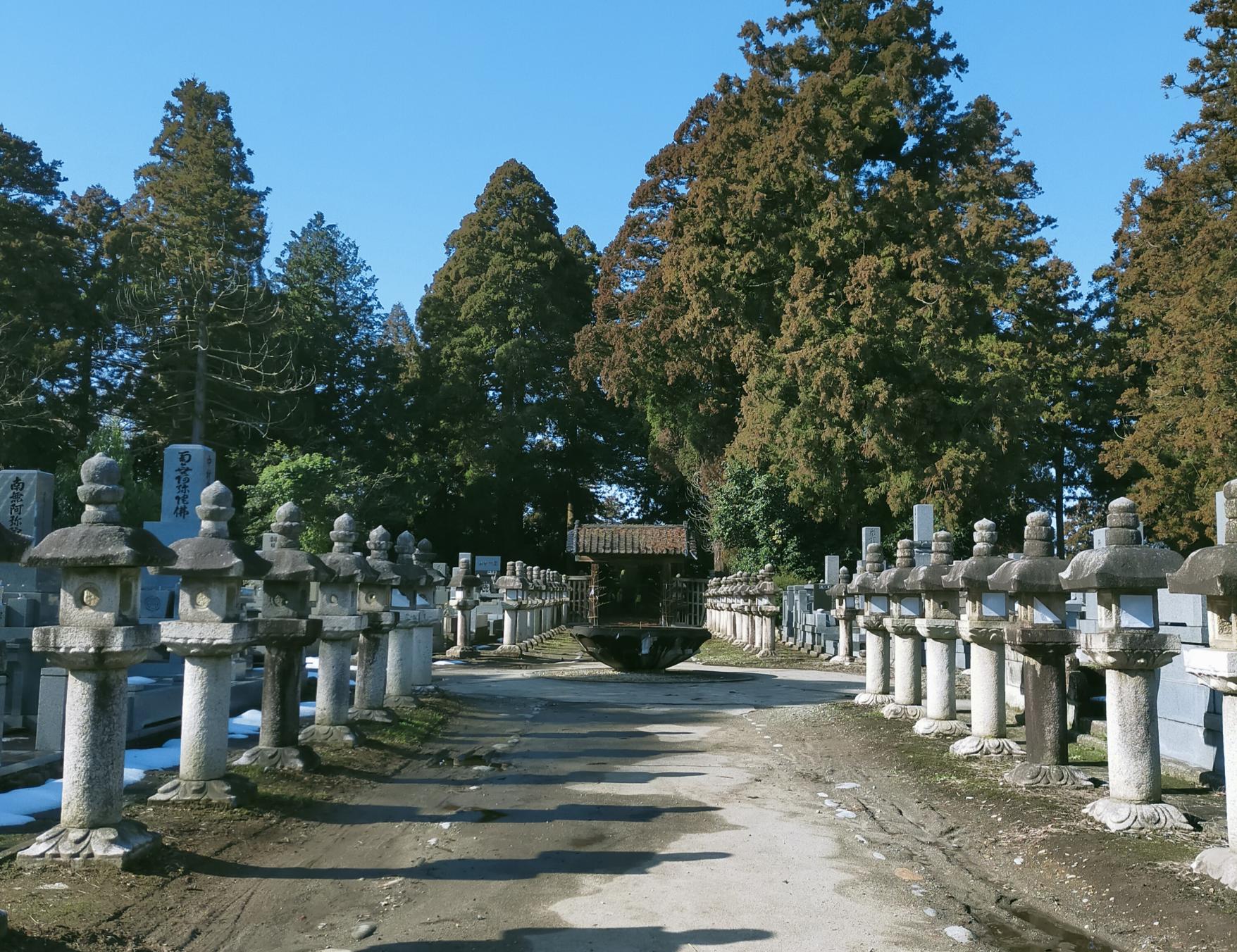 初代藩主前田利次は、呉羽山の一角「百塚山」に築城を夢見ていましたが、財政難のために断念し夢果たせぬまま急逝しました。この父を思った子の正甫が百塚山に隣接する長岡(富山市八ケ山)に墓地を建立しました。周りには、12代までの歴代藩主とその一族のお墓がつくられています。周辺一帯は公園墓地となっており、多くのお墓が建てられています。