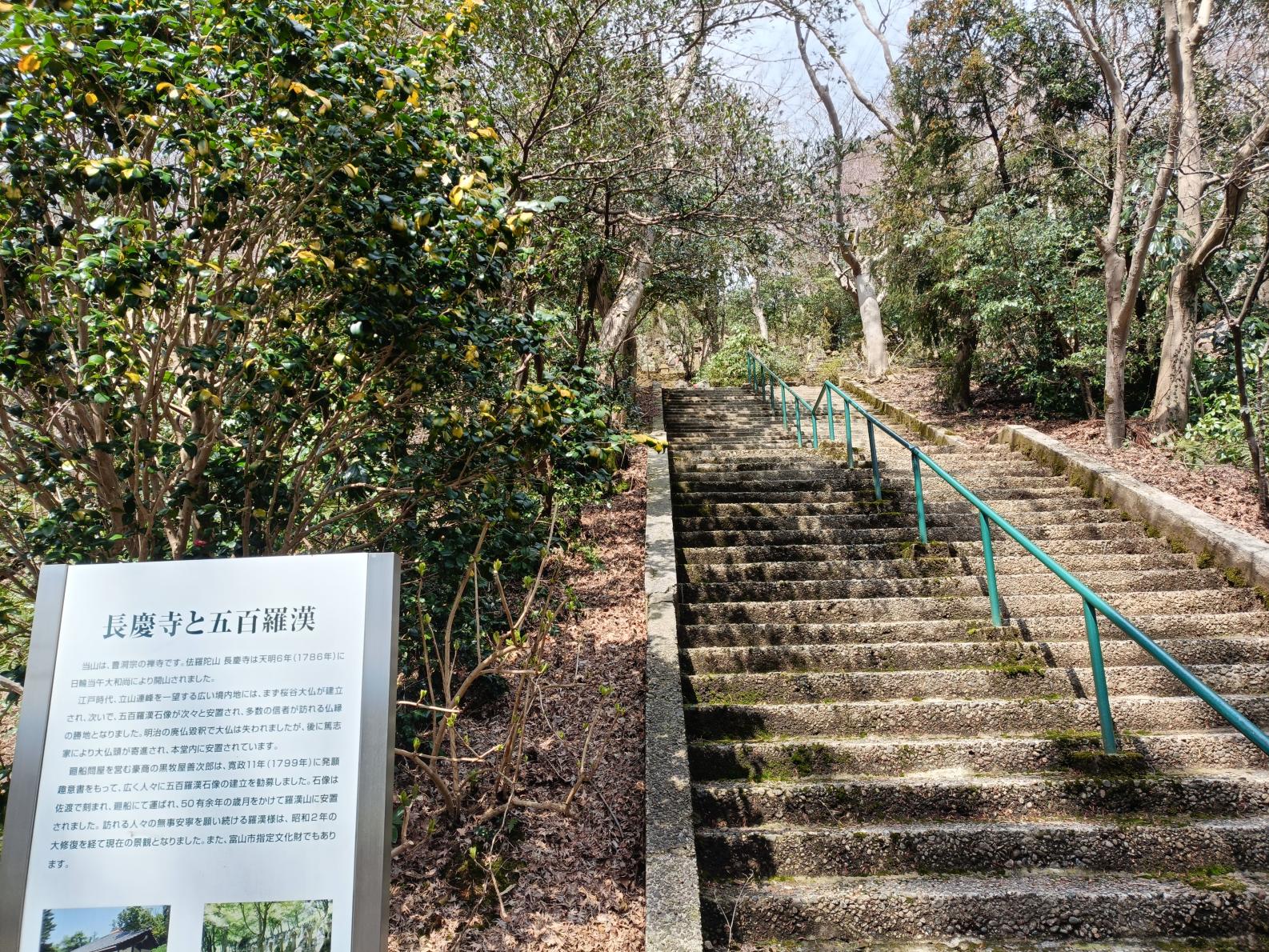 長慶寺の境内には、五百羅漢があります。江戸時代、富山城下で米穀商と廻船問屋を営む豪商が、50数年かけて佐渡の石工が彫った石仏を北前船で運んだそうですよ。