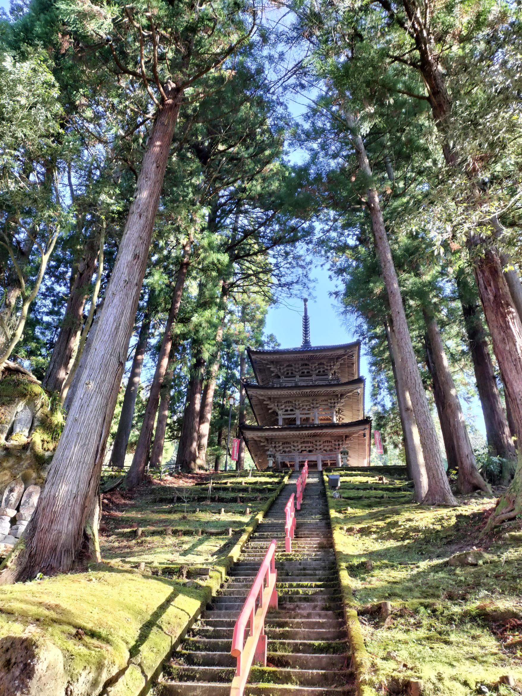 本堂向かって右に見える「三重塔」は江戸時代末期に建立された富山県最古の塔です。壁がなくて内部が見えるのは、とても珍しいそう。地面を覆う苔の緑と大きな杉の木が塔を引き立てていて、とても素敵だと思いませんか〜?