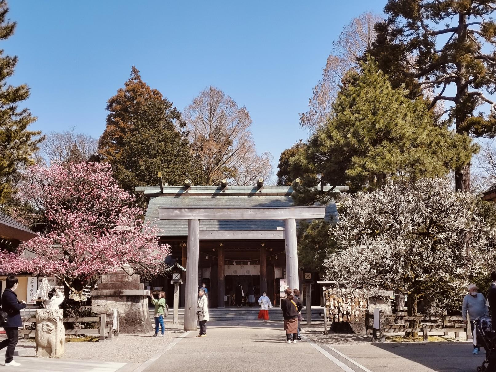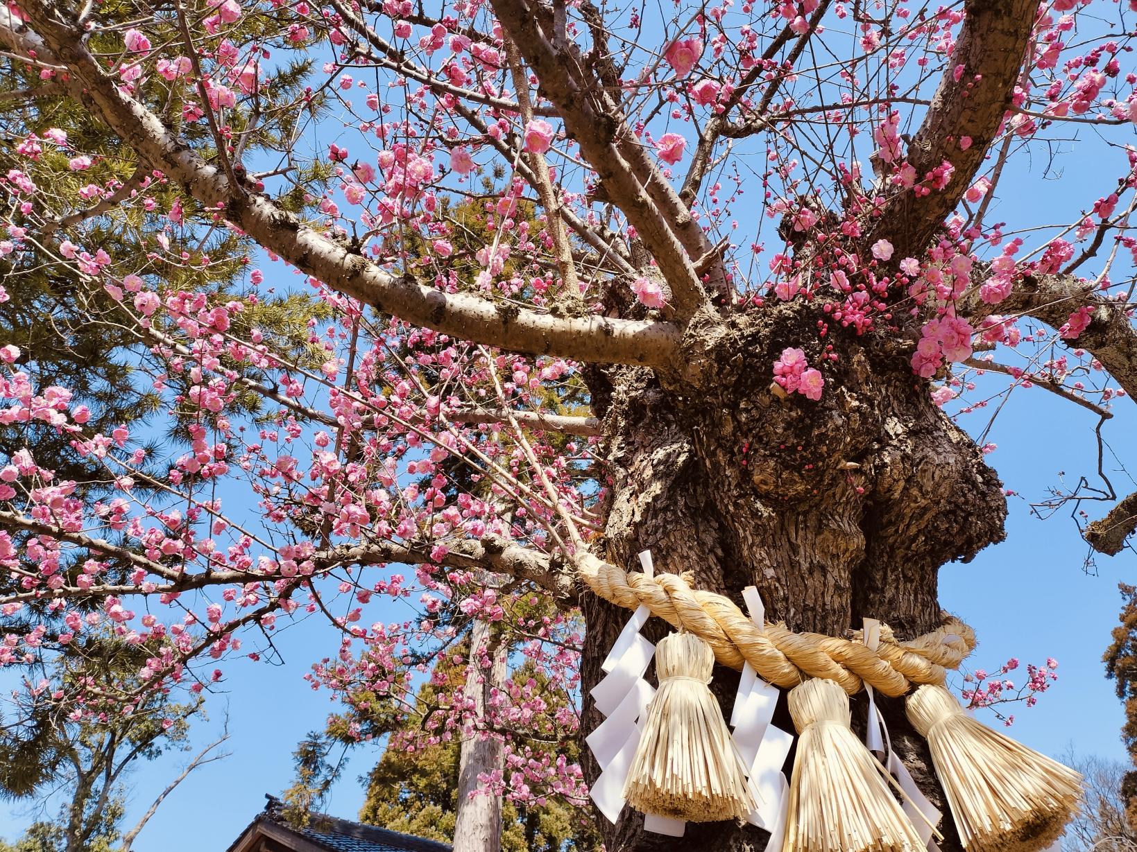 3月頃には社殿の前に紅白の梅の木が咲き、とても綺麗です。紅梅は樹齢400年以上の御神木です。
