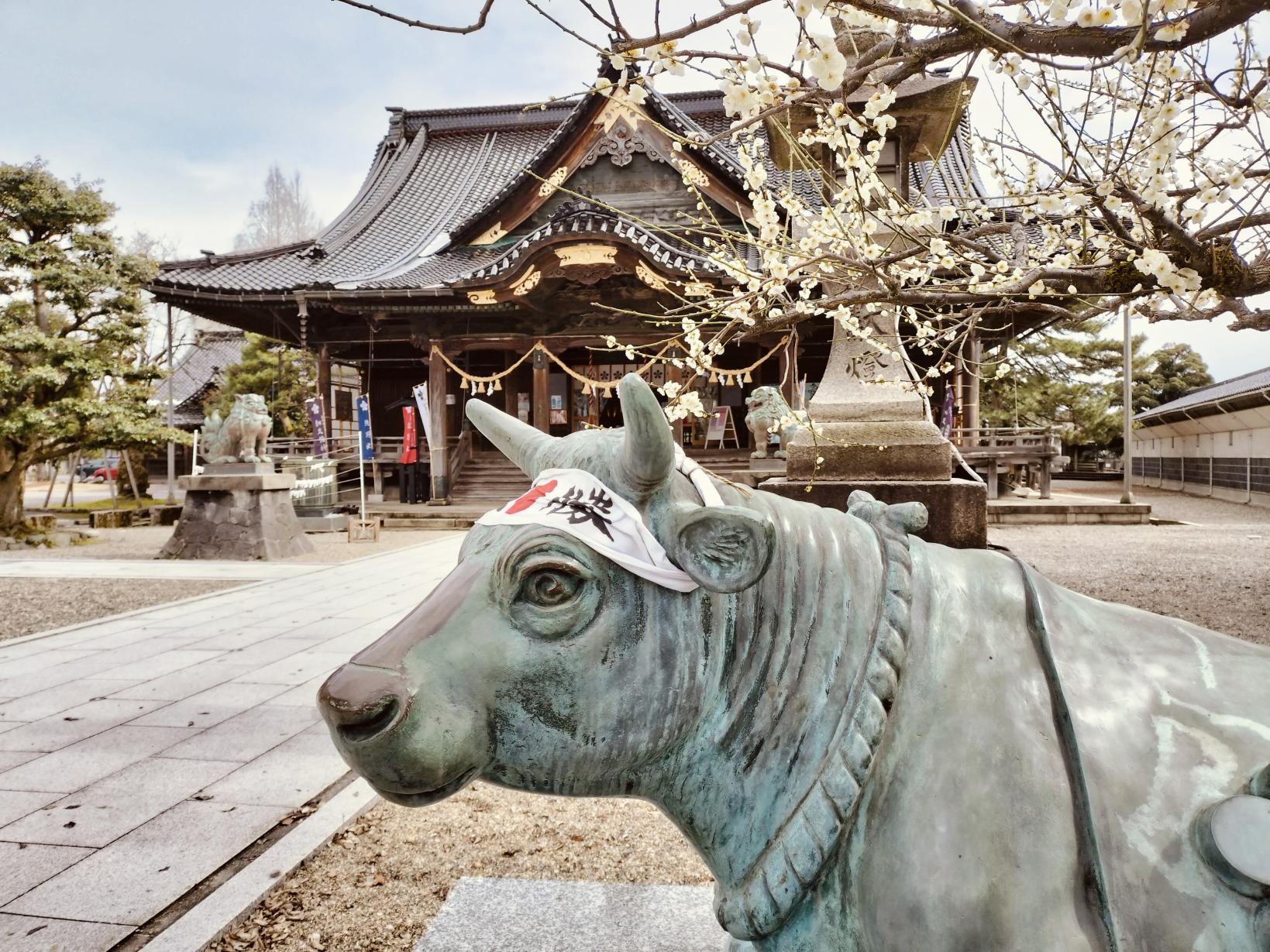 高岡関野神社にお祀りされている菅原道真公(天神様)は、牛をとても大切にしており、牛は「天神様の使い」と言われています。「ねまり牛(富山弁「座る」を「ねまる」と言う)」が奉納されており、なでると御利益をいただくことができます。また天神様が愛でていた梅の木が植えてあり、3月頃に梅の花も楽しめます。