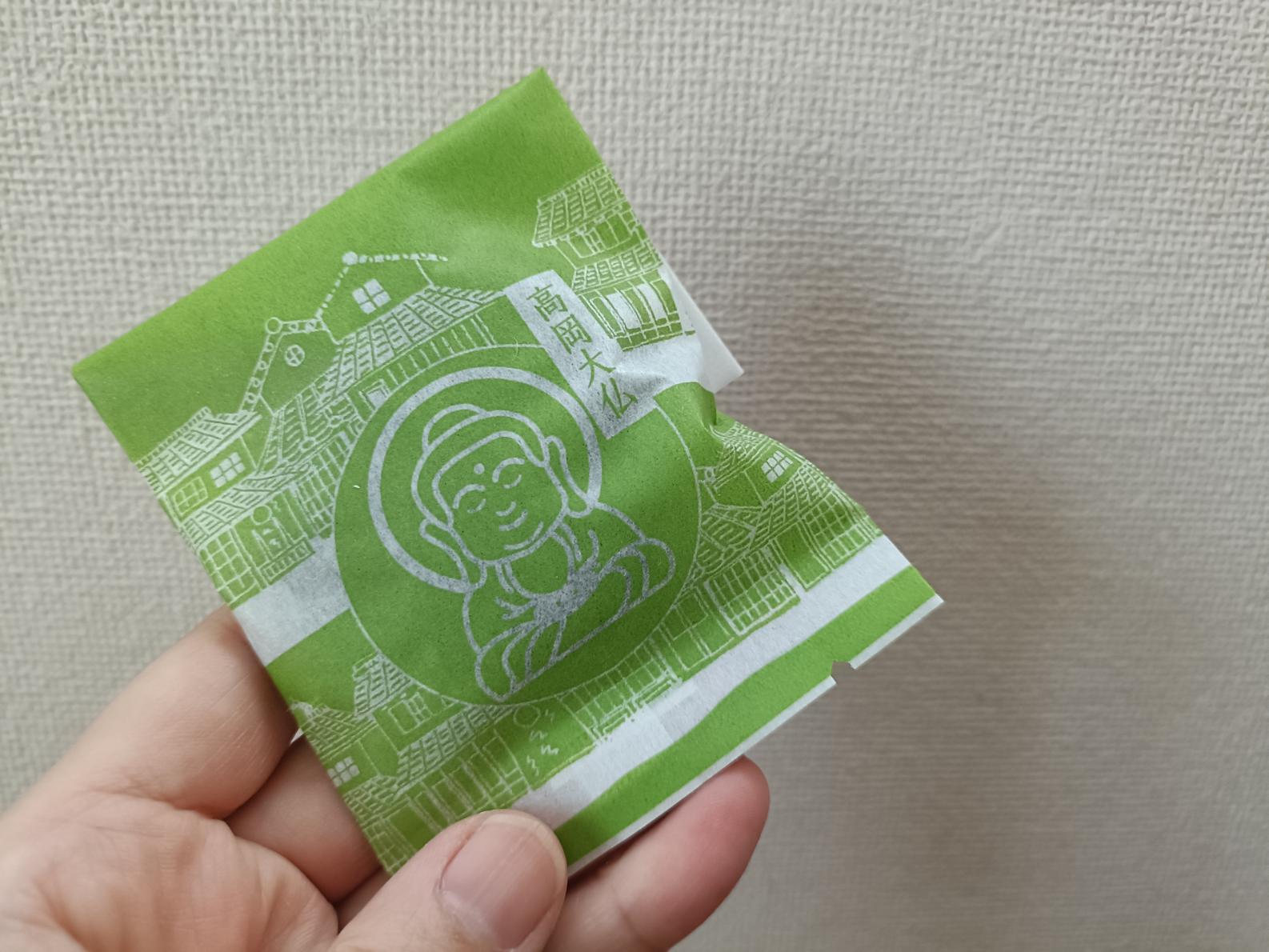 不破福寿堂でクーポンと交換できるのは「高岡大仏」。生地も餡も抹茶味のしっとりとした和菓子でした。